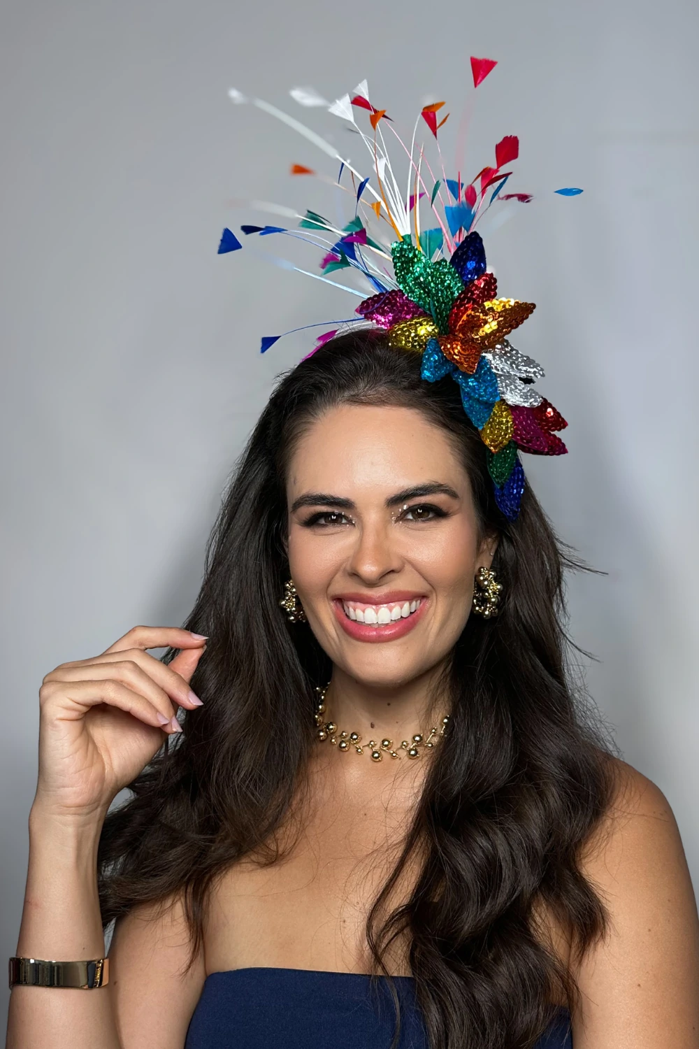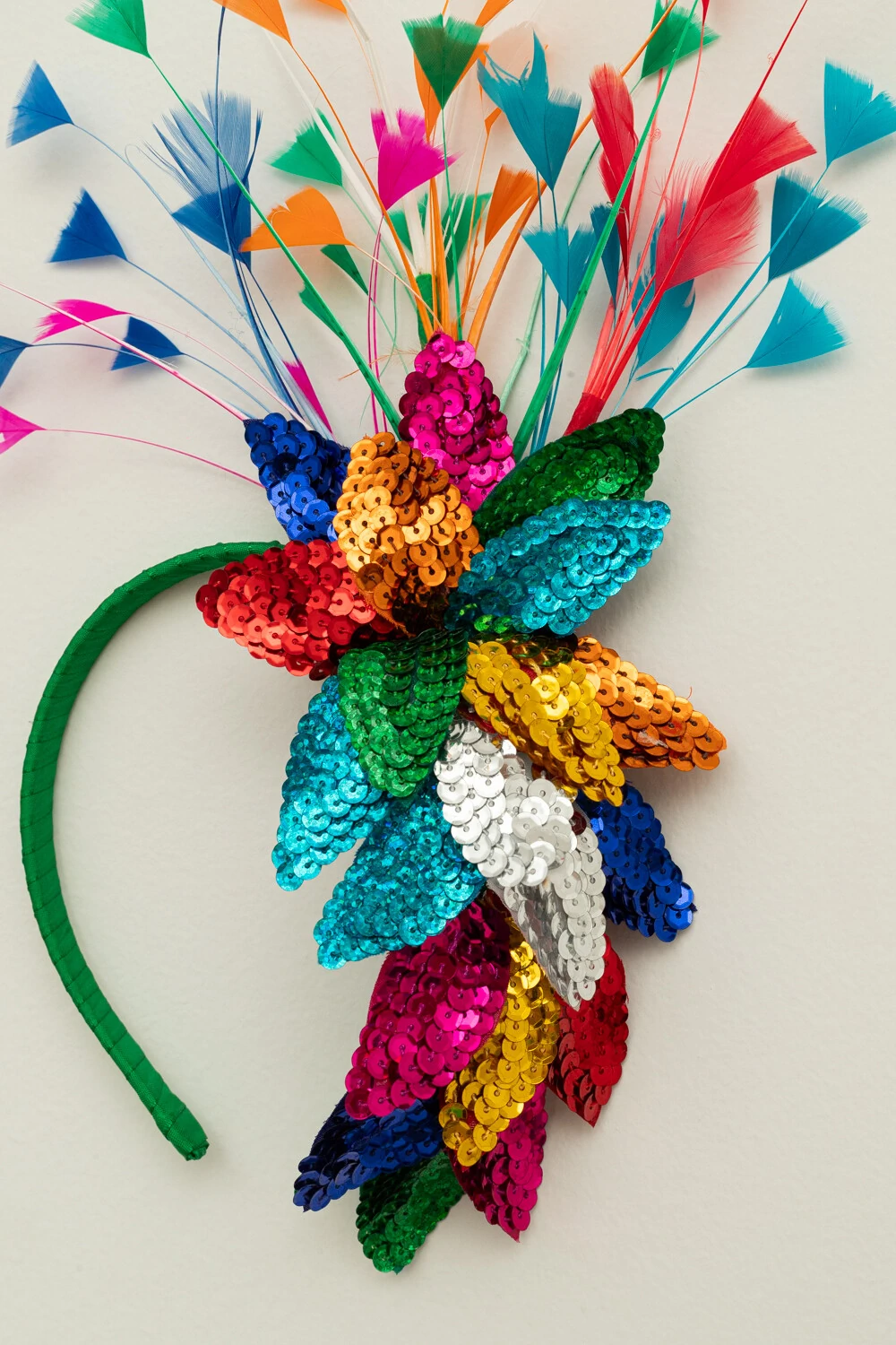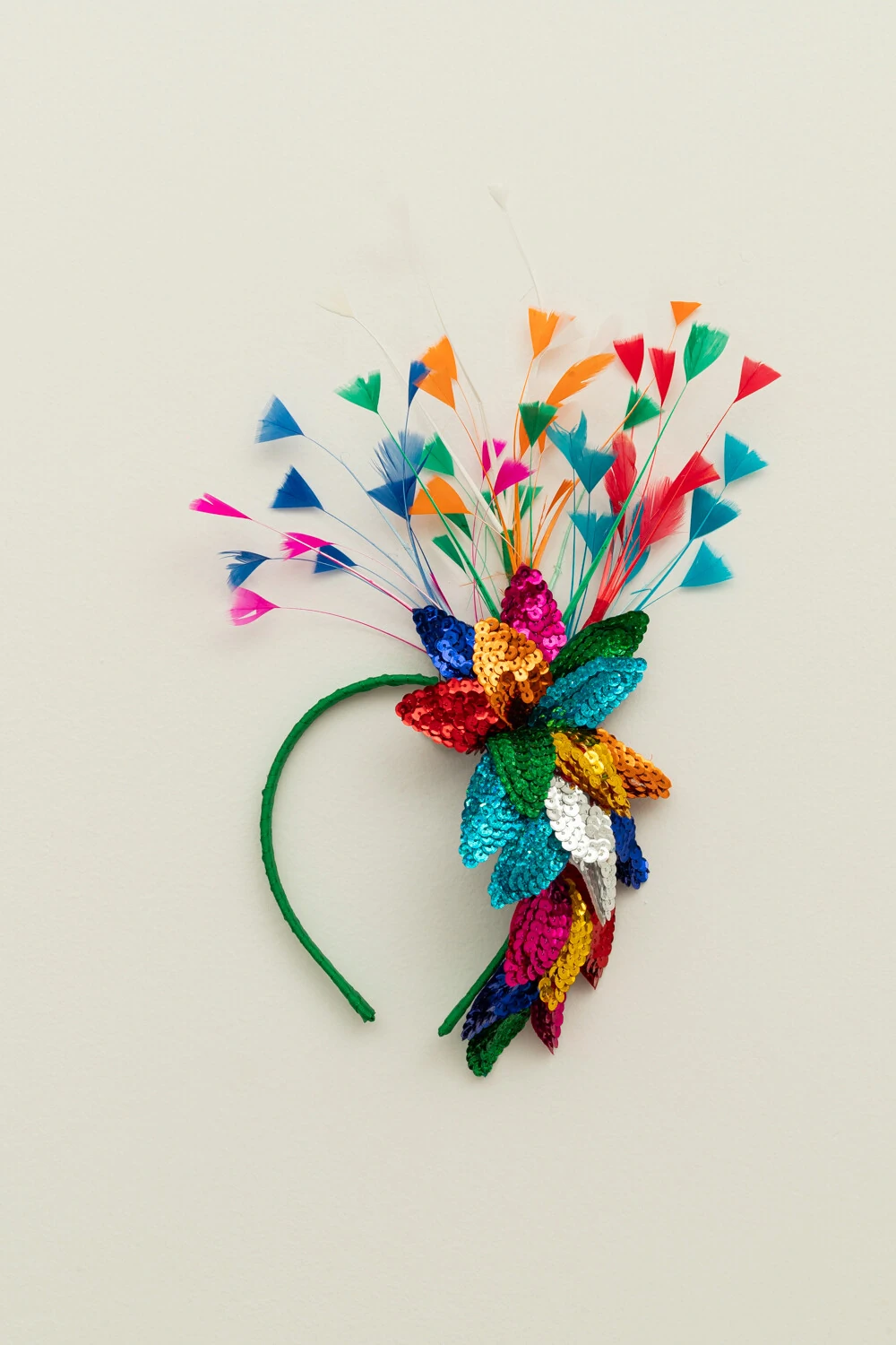 Tiara com aro verde e detalhes em folhas com paetê e penas coloridas. Que tal dar um charme especial no seu look carnaval?! Deixe a sua criatividade rolar e arrase.