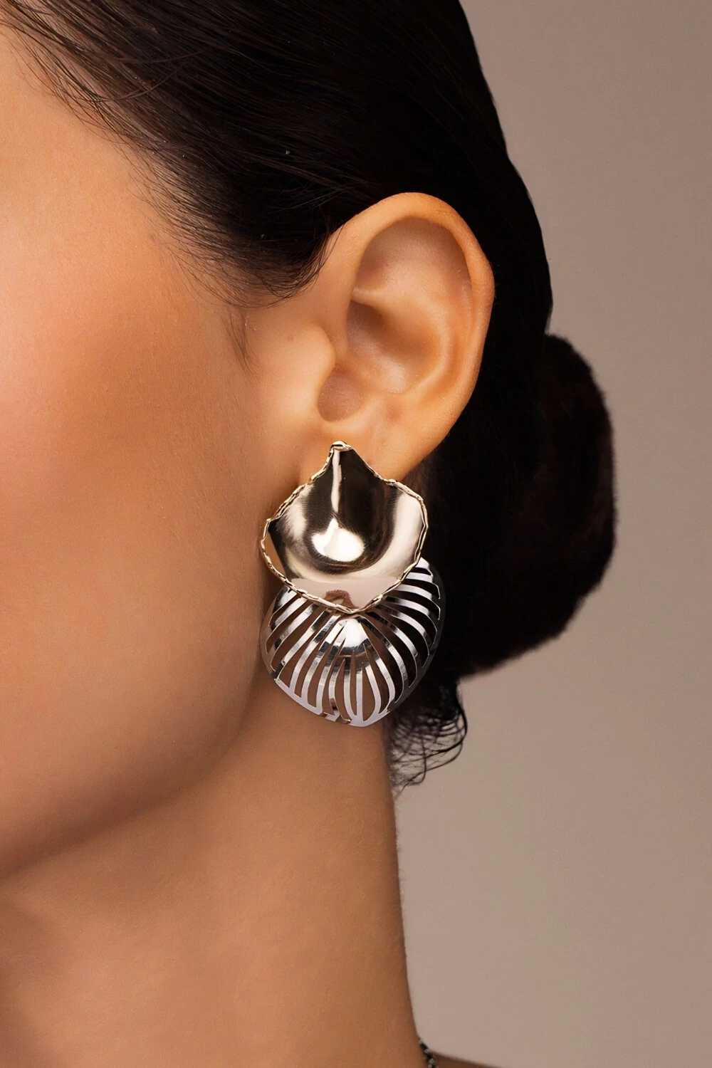 Brinco lirius dois tons dourado e prateado, base metal lisa dourada e parte inferior prateada vazada você pode usar junto ou separadas. Formando uma peça super arrojada e fashionista.