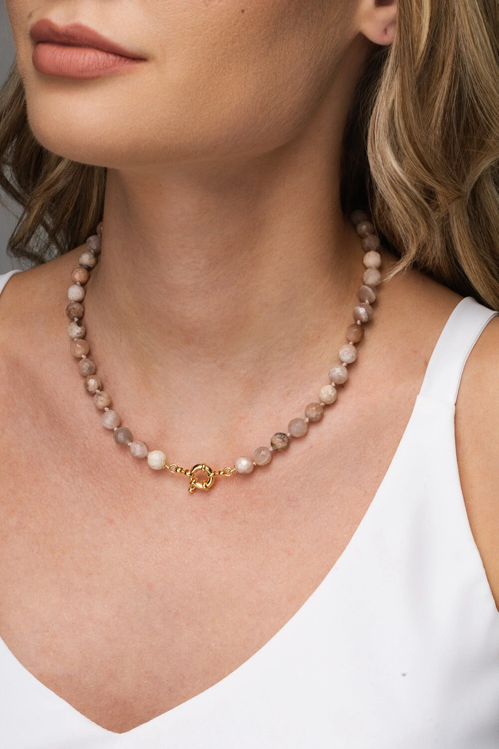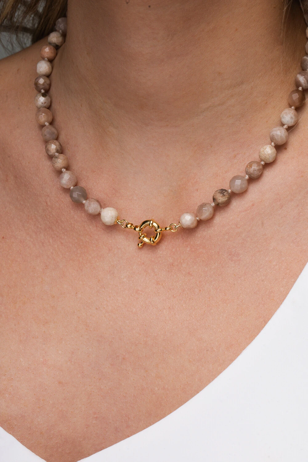 O colar é composto por um fio pedra da lua e fecho boia no banho ouro 18k.