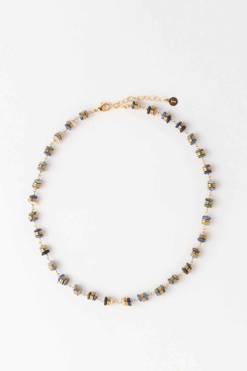 Colar com banho de ouro 18K, composto por esferas de sodalita azul e hematitas em tons metálicos, que proporcionam um contraste sofisticado e contemporâneo. A sodalita é conhecida por estimular a clareza mental e a comunicação, enquanto a hematita traz proteção e equilíbrio energético. Um acessório elegante e cheio de significado, ideal para quem busca estilo com propósito e boas energias.