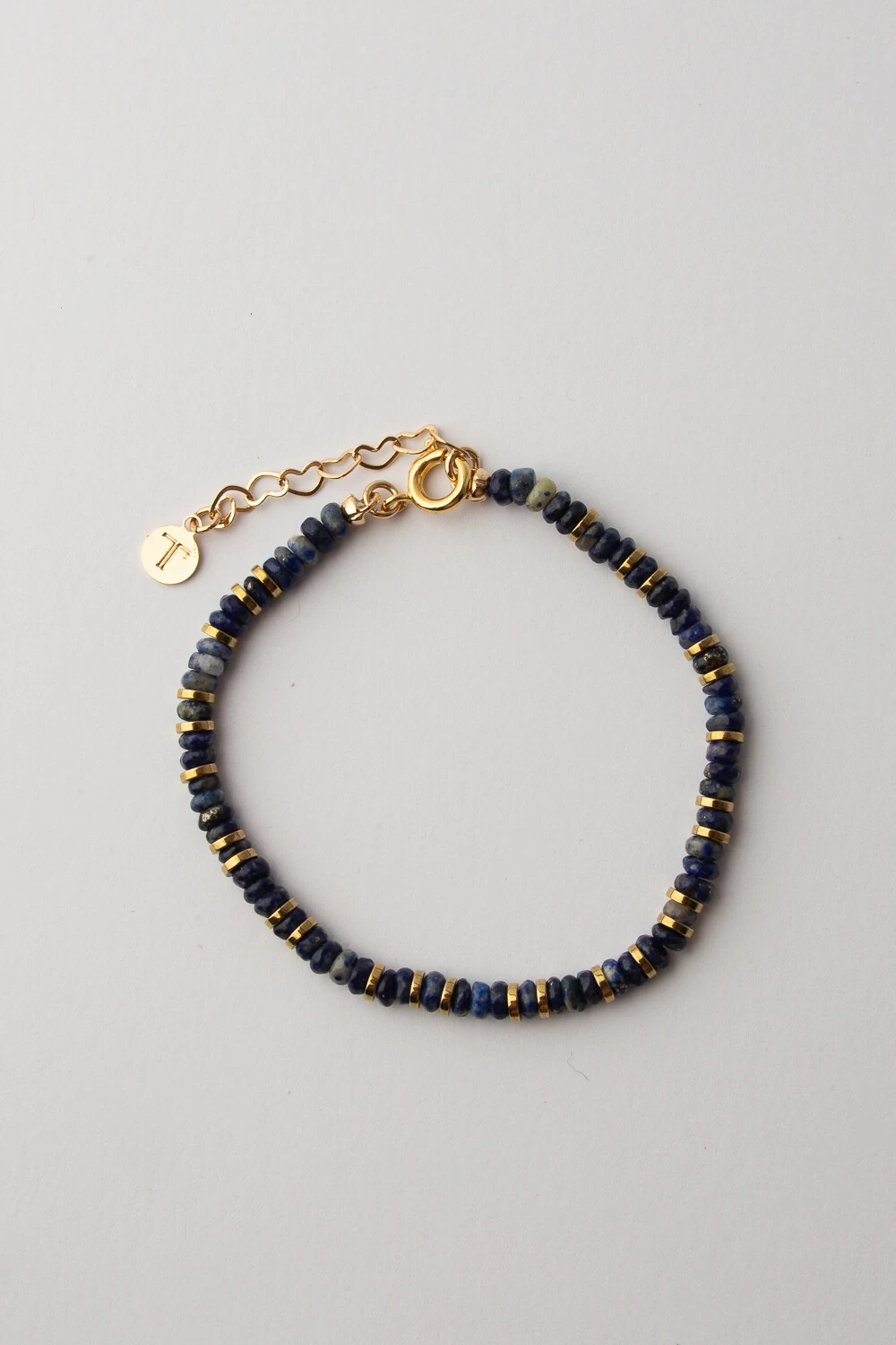 Pulseira com pedras lápis lazuli, intercaladas com hematita e detalhes em banho ouro 18K. Uma peça autoral elegante e sofisticada, ideal para compor produções modernas com um toque de exclusividade.