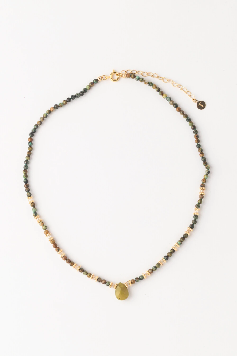 Colar autoral delicado com pedras turquesa africana em tons terrosos, intercalados com zircônia em cubo e um pingente gota jade verde. Uma peça versátil, perfeita para compor produções e valorizar combinações casuais.