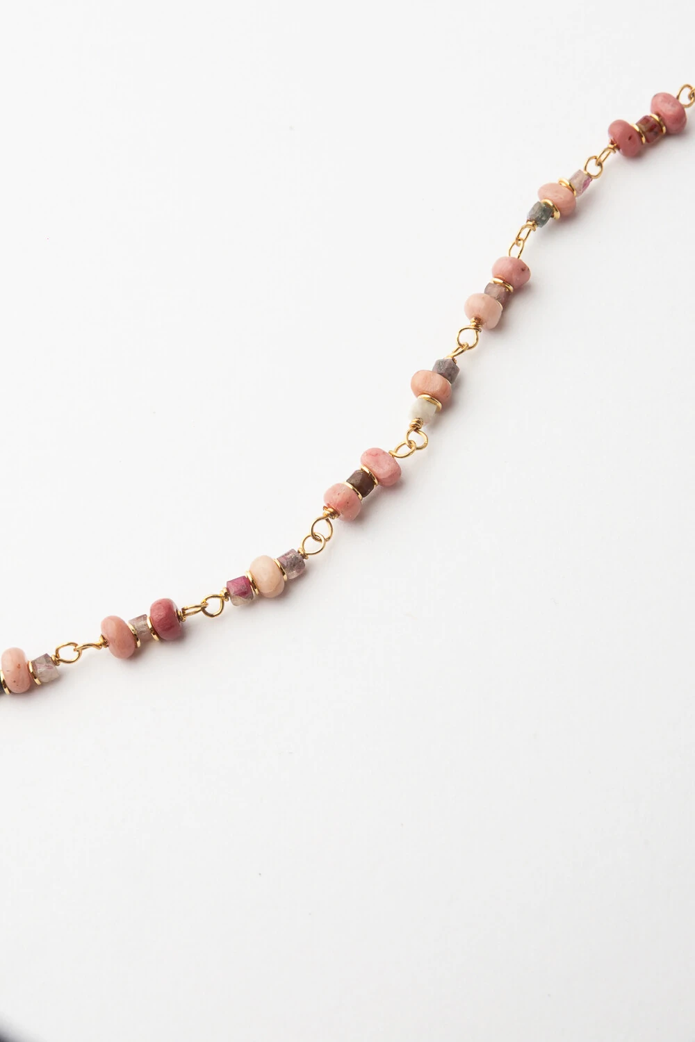 Pulseira banho ouro 18K uma peça autoral que combina rodocrosita com turmalina rosa. Juntas, essas pedras criam uma sintonia perfeita, resultando em uma pulseira que não é apenas um acessório de beleza, mas também um amuleto de boas energias.