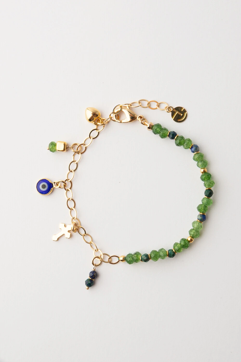 Pulseira feita com jade facetada verde intercaladas com detalhes dourados e azul marinho, trazendo um contaste vibrante e sofisticado. Com corrente banho ouro 18k e pingentes delicados de olho grego, coração e cruz que dão charme e simbolismo à peça.