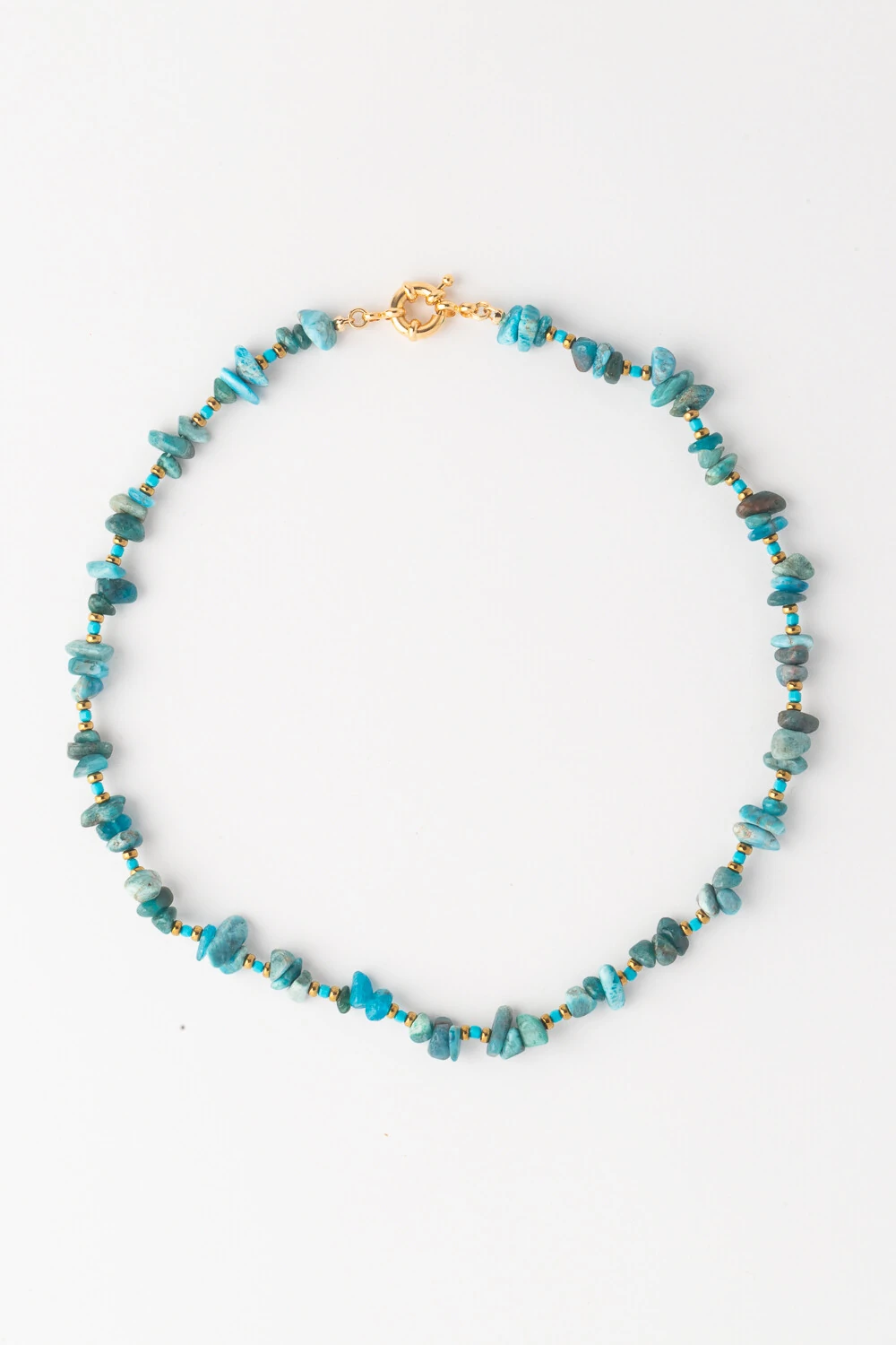 Colar autoral, delicado e cheio de boas energias, este colar traz a beleza natural do cascalho de apatita combinado à cor turquesa, criando uma peça única e vibrante. O banho em ouro 18k valoriza ainda mais o design, garantindo brilho sofisticado e acabamento refinado.