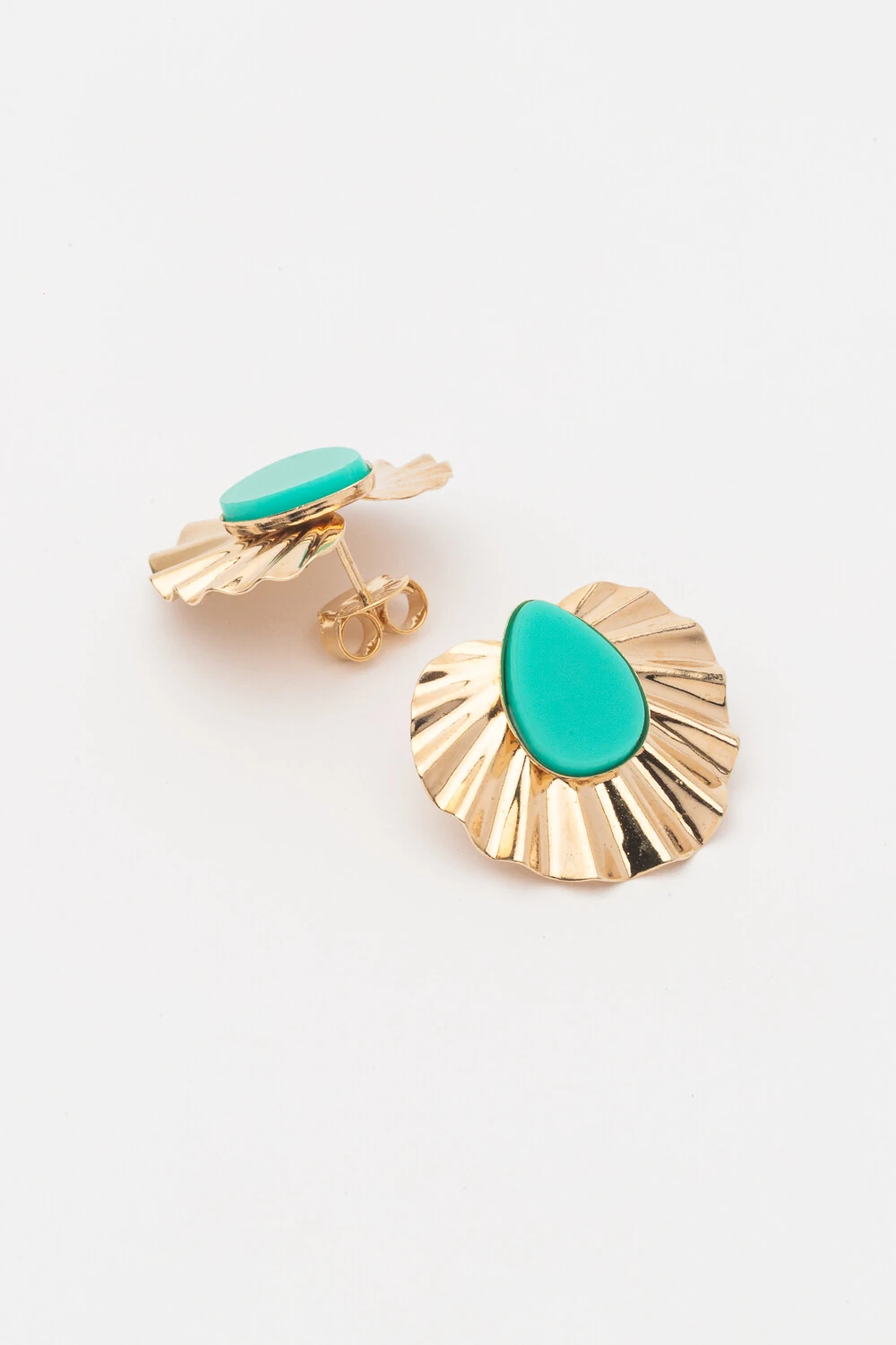 Brinco dourado em formato de leque com gota na cor turquesa. Uma peça sofisticada e cheia de personalidade ideal para dar destaque ao visual.