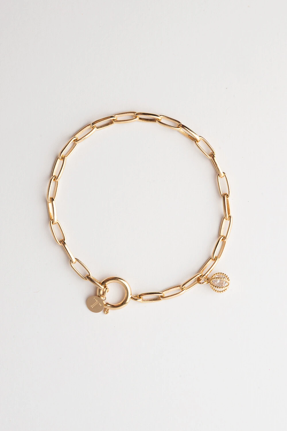 Pulseira em elos ovais e cápsula de zircônia banho ouro 18K. Uma peça básica que não pode faltar no seu look do dia dia.
