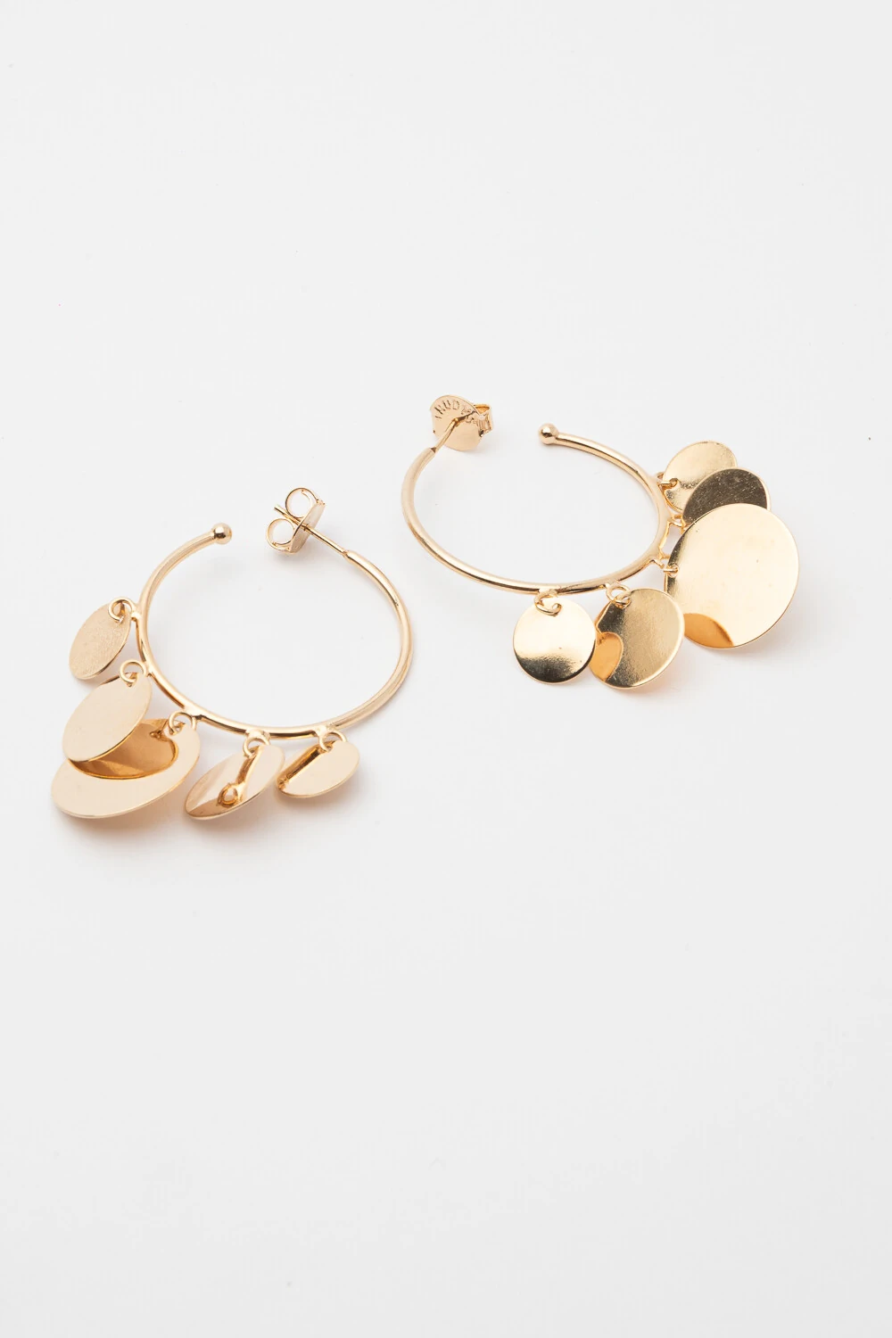 Brinco argola dourada com plaquinhas um design moderno. Ideal para quem busca um acessório versátil, que une o rústico ao glamoroso, perfeito para elevar produções casuais ou complementar looks mais elaborados.