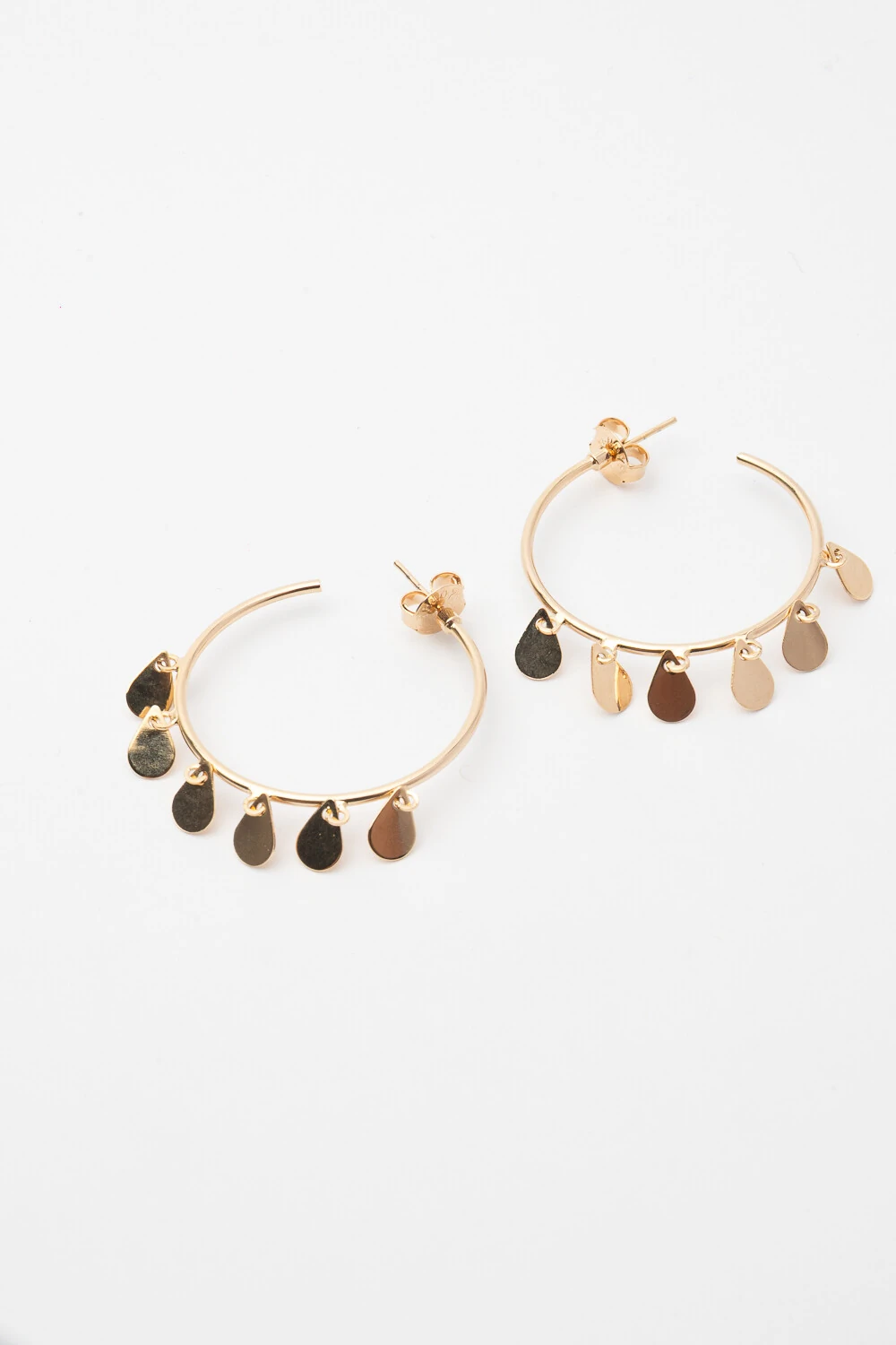 Brinco dourado design em argola aberta, garante leveza e modernidade, enquanto as gotinhas delicadas trazem movimento e um brilho sutil ao visual.