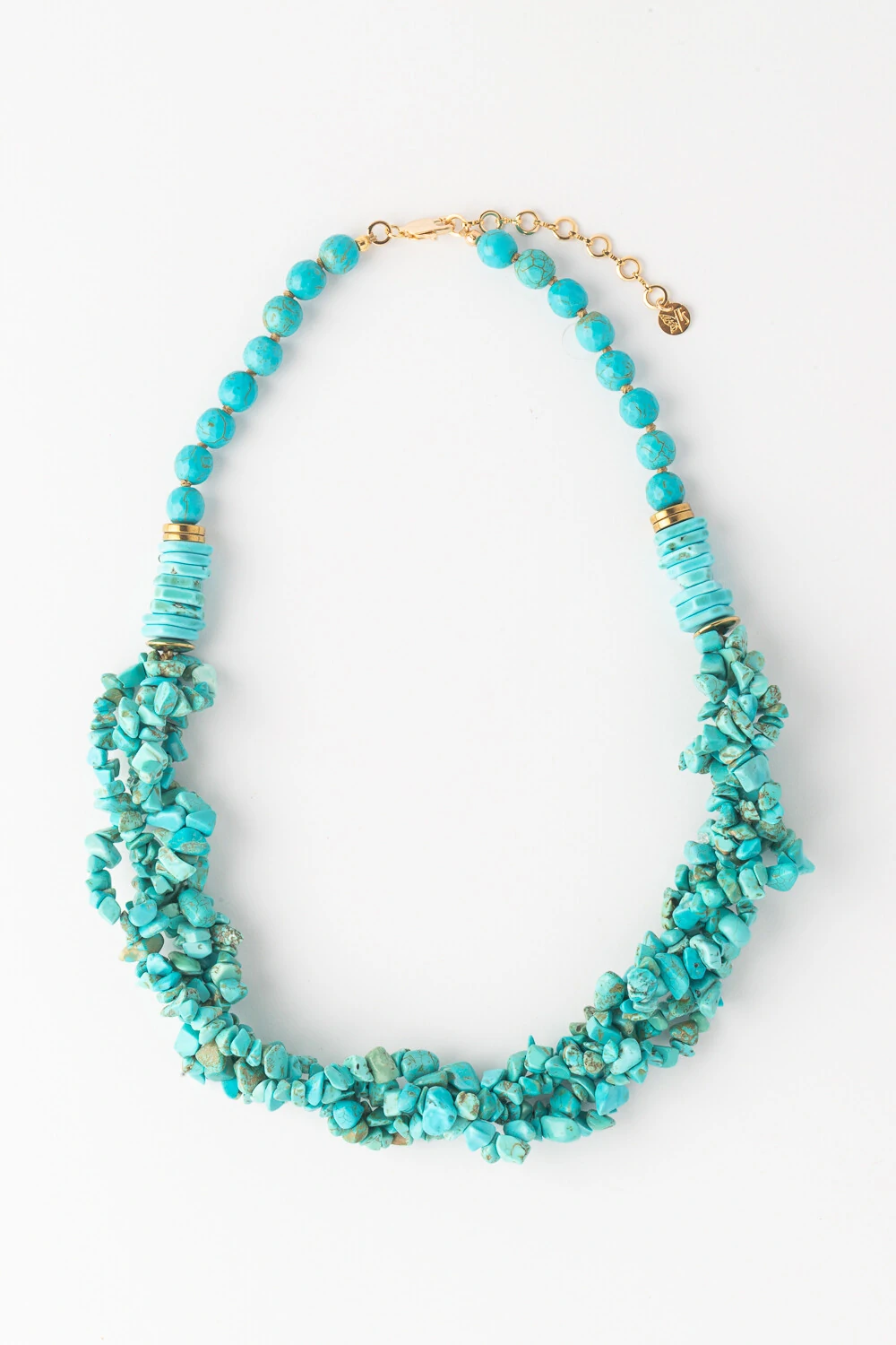 Cheio de personalidade, colar autoral confeccionado em cascalhos de howlita na cor turquesa, destacando o tom vibrante da pedra que traz leveza e frescor ao visual. Uma peça versátil, perfeita para compor produções do dia a dia ou para dar um toque de cor em combinações mais sofisticadas.