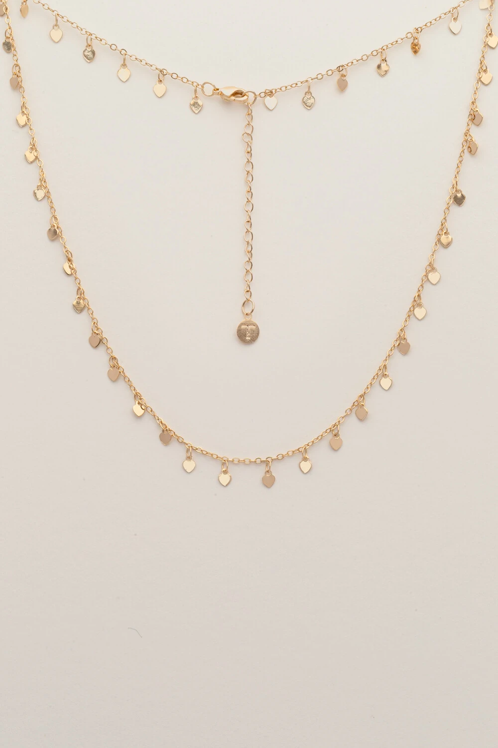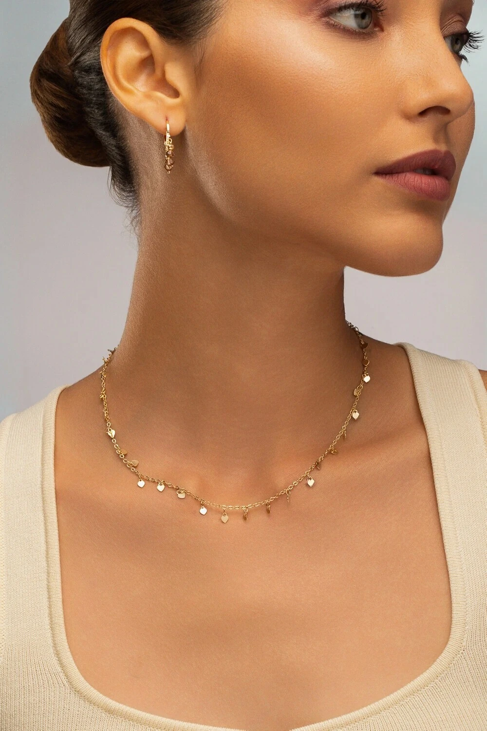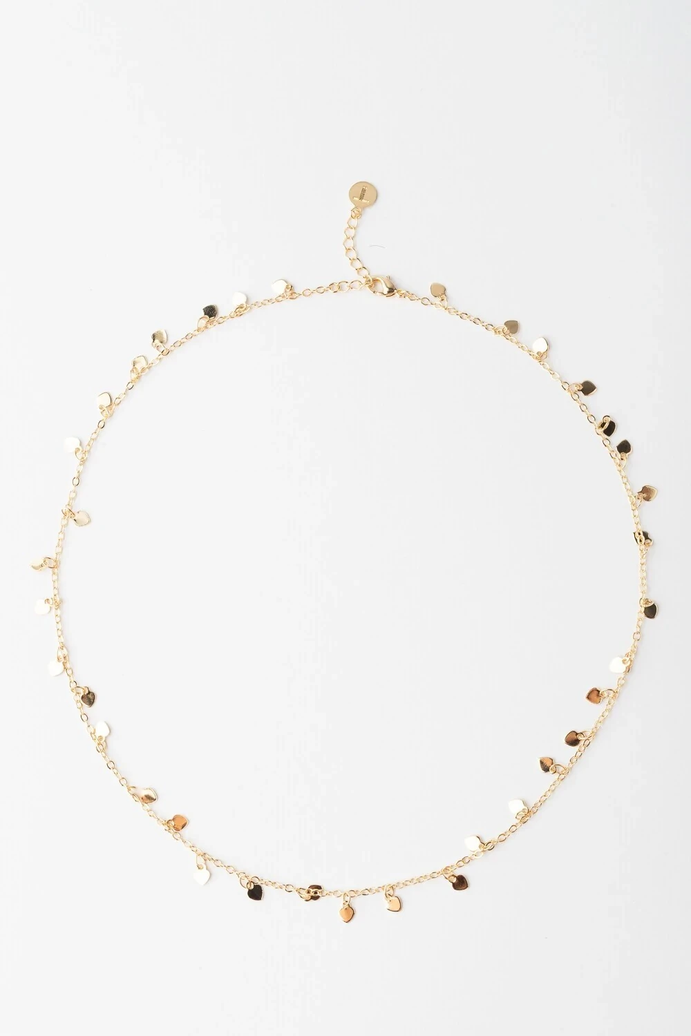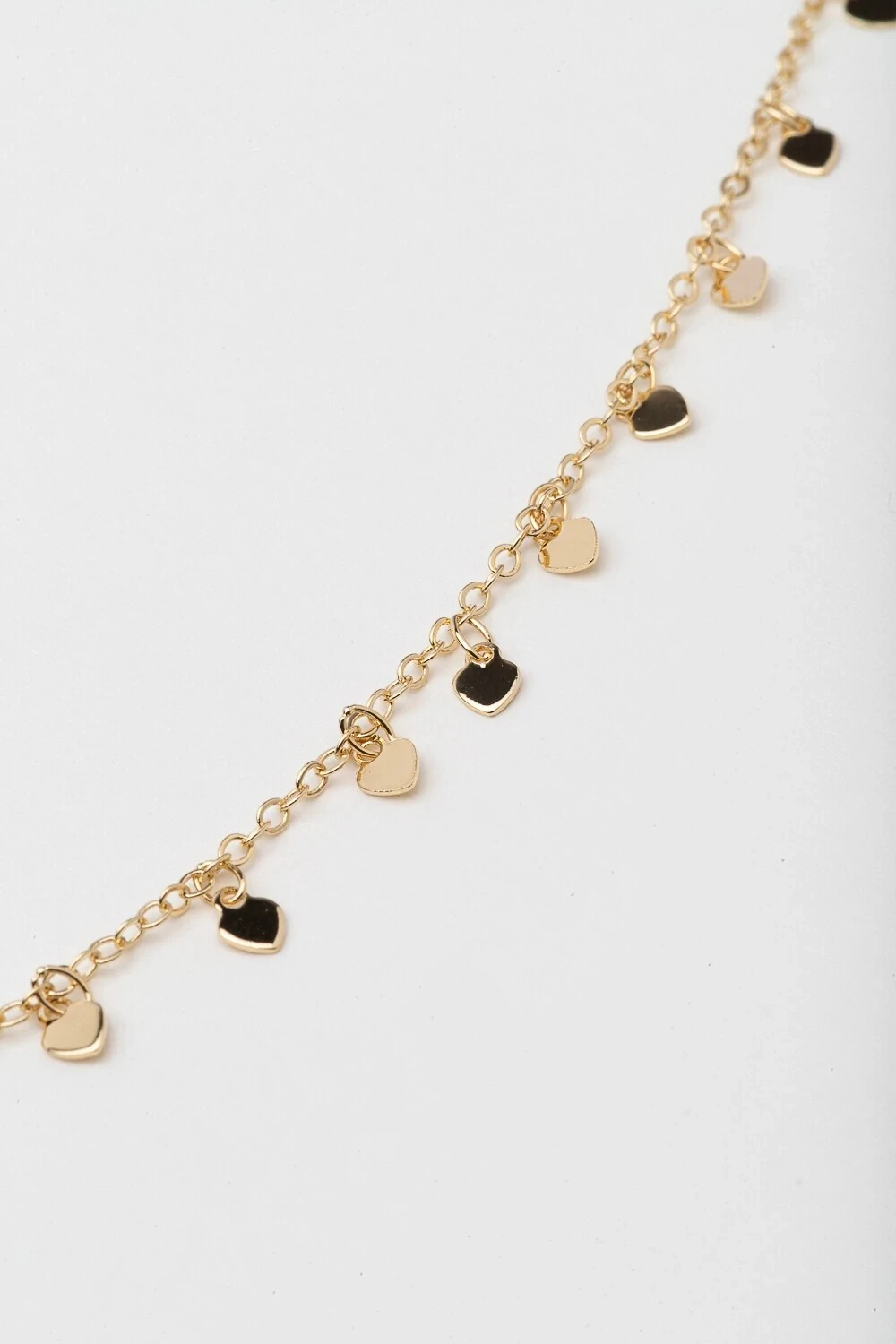 Colar choker banho ouro 18k, corrente elos e possui em toda sua extensão plaquinhas mini corações liso. Um colar básico chic. Ideal para usar com outros colares e faça suas composições ficarem ainda mais incríveis.