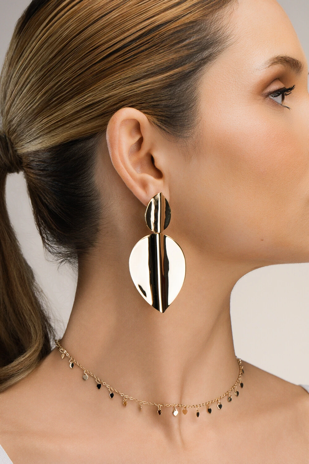 Brinco dourado metal liso forma de folha. Com design assimétrico feito em material leve e confortável, é ideal para usar tanto no dia a dia quanto em ocasiões especiais.