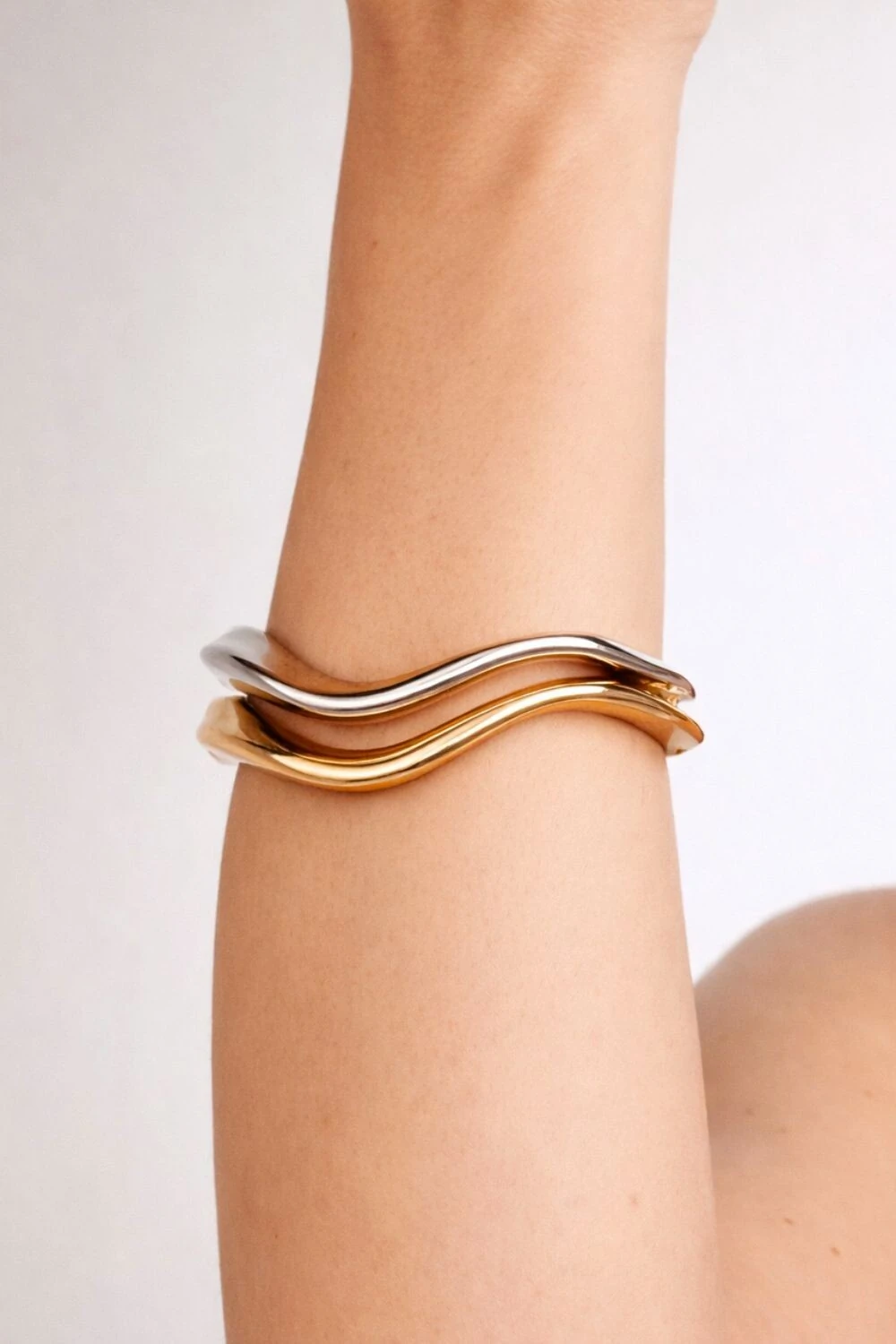 Pulseira bracelete ondas apresenta um aro irregular que traduz leveza e fluidez em cada curva. Sua abertura lateral garante conforto e praticidade, enquanto o design escultural confere um toque moderno e sofisticado.