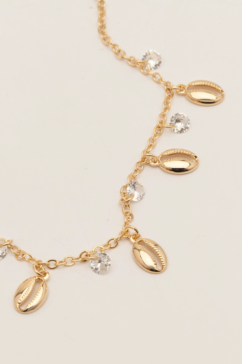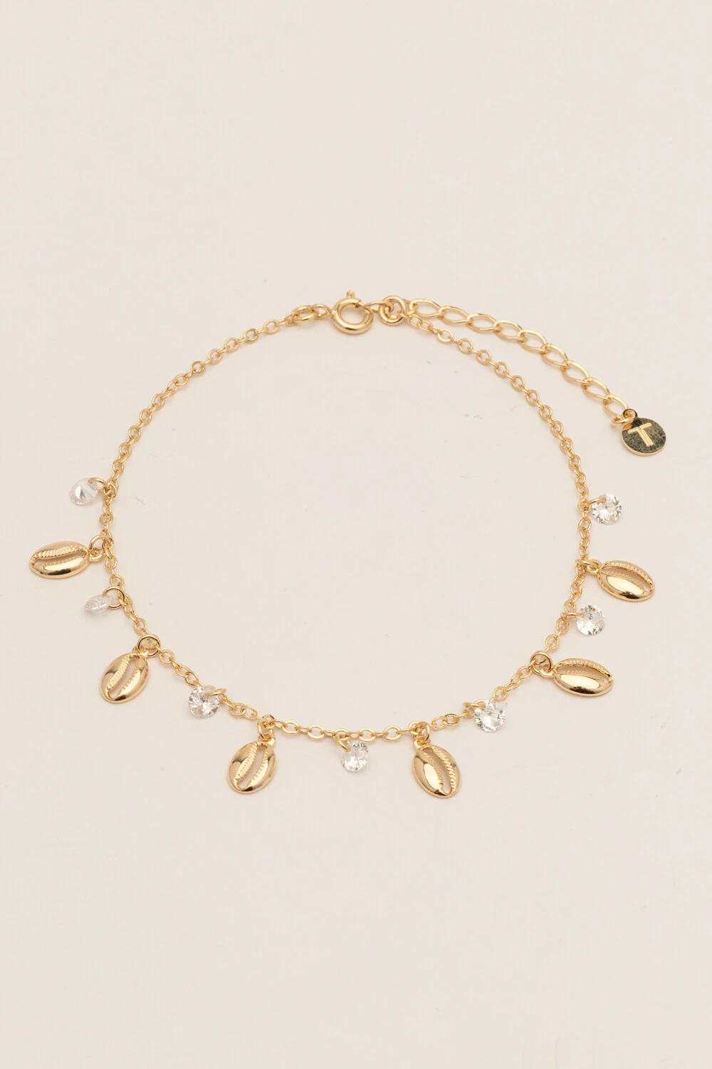 Tornozeleira composta por plaquinhas de búzios e zircônia cristal banho ouro 18k, a peça traz leveza e elegância ao tornozelo, ideal para compor produções de verão com um toque refinado.