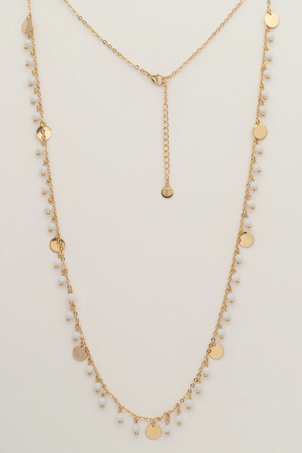 Colar Longo com plaquinhas douradas e cristais off white uma peça delicada e super elegante. Use sozinho para um toque minimalista ou combine com outras correntes para um mix cheio de estilo.
