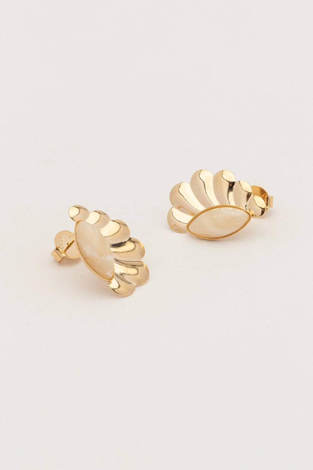 Brinco dourado concha em resina madre. Leve, moderno e perfeito para looks de verão.