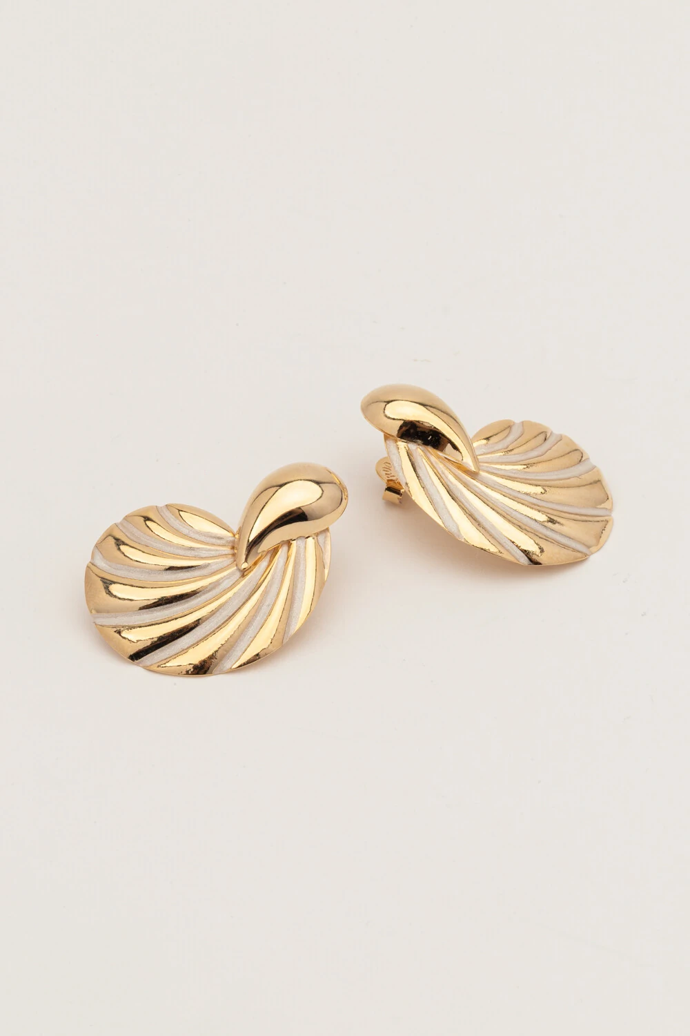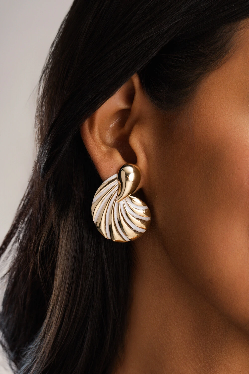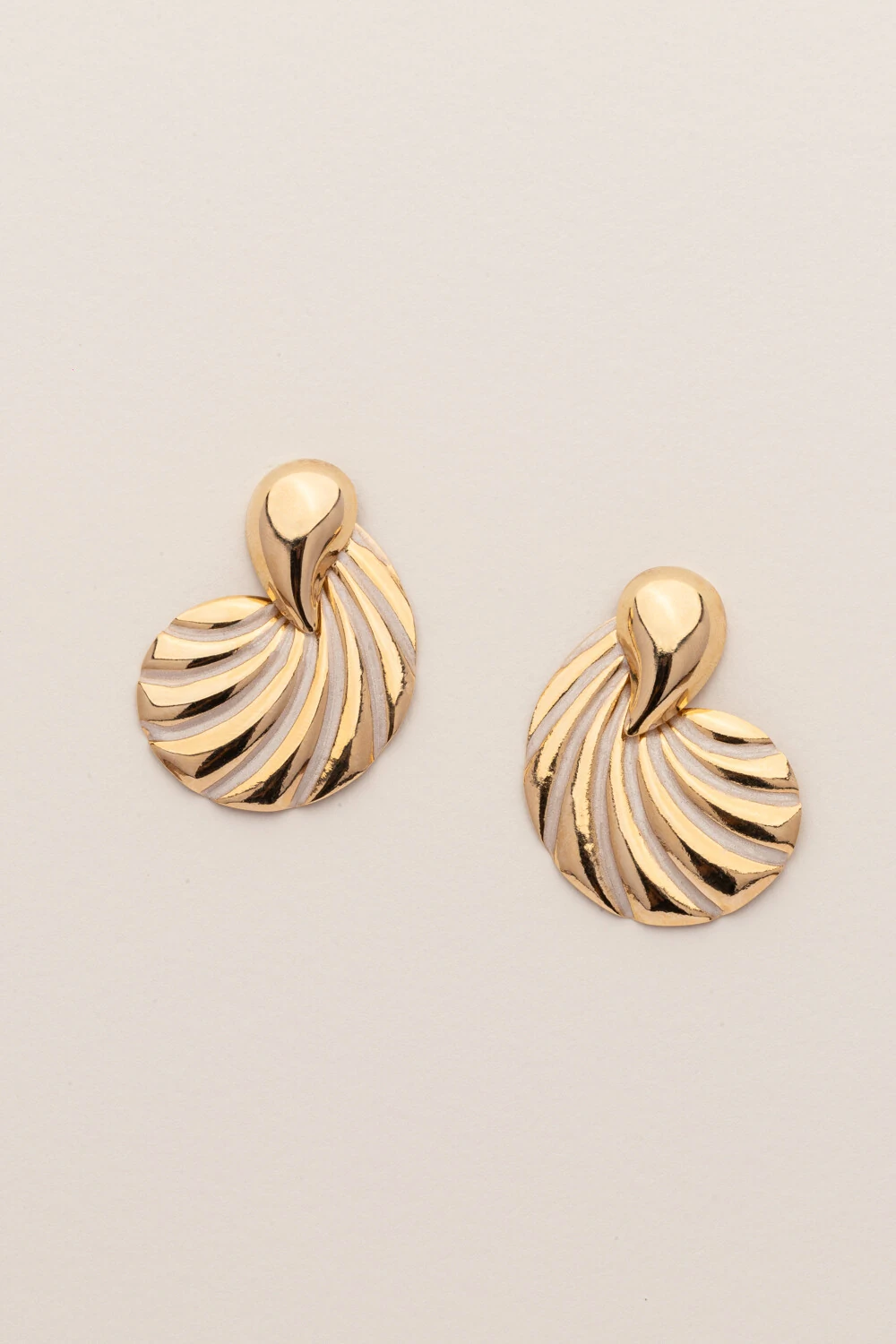 Brinco dourado com base em formato de gota com efeito de ondas e detalhe em resina madrepérola. Design leve e elegante, ideal para destacar o visual.