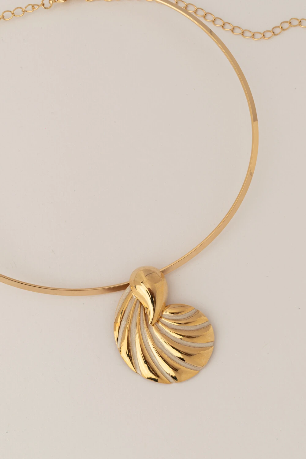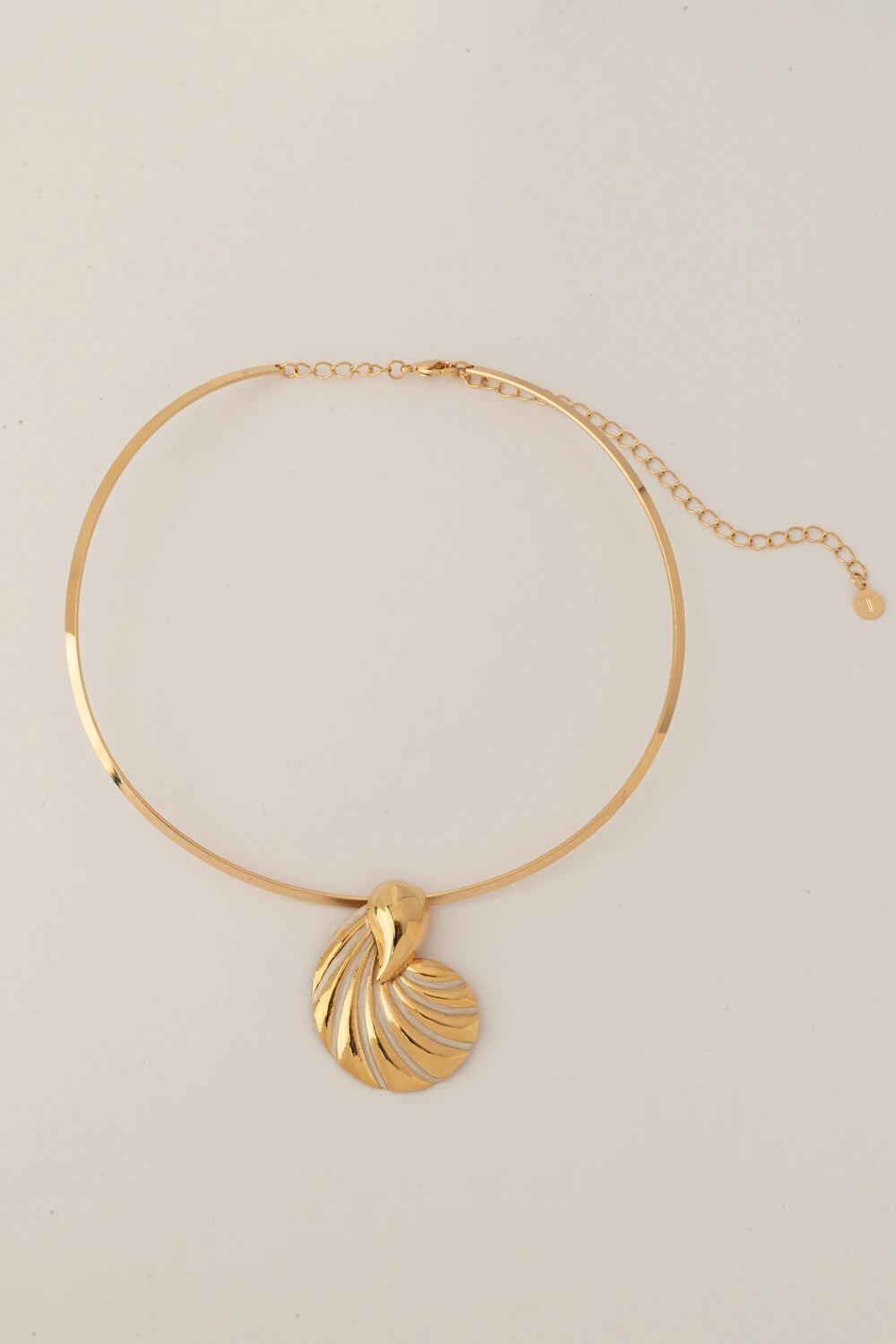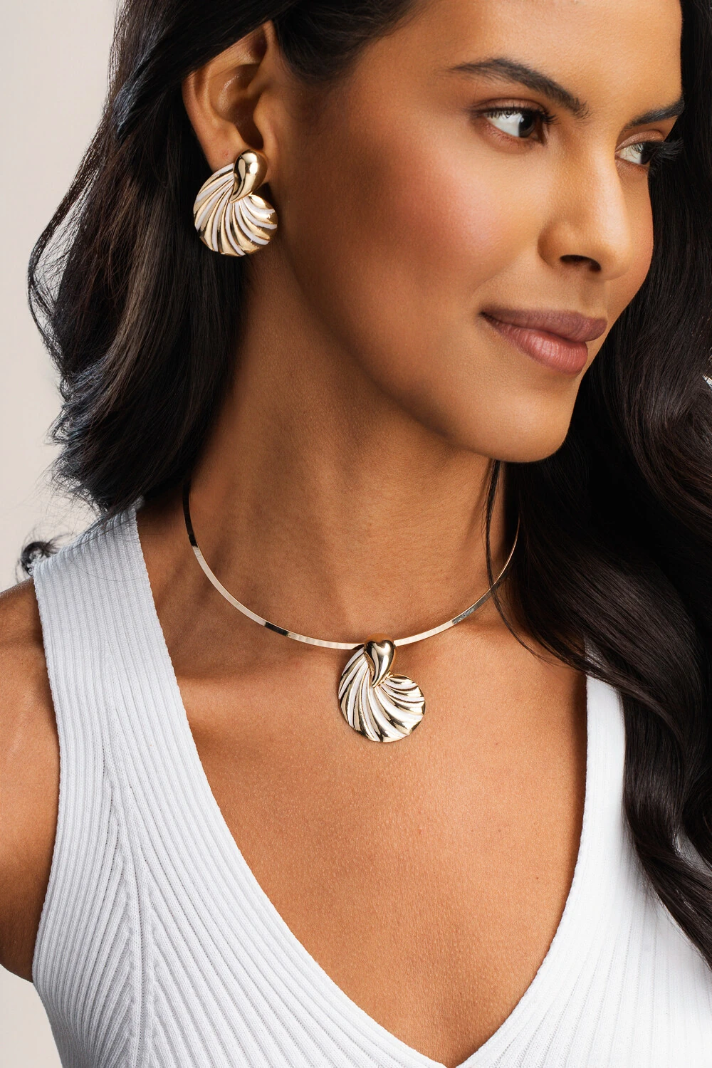 Colar aro dourado com pingente gota metal liso e ondas detalhe em resina madrepérola. Design leve e elegante, ideal para destacar o visual.
