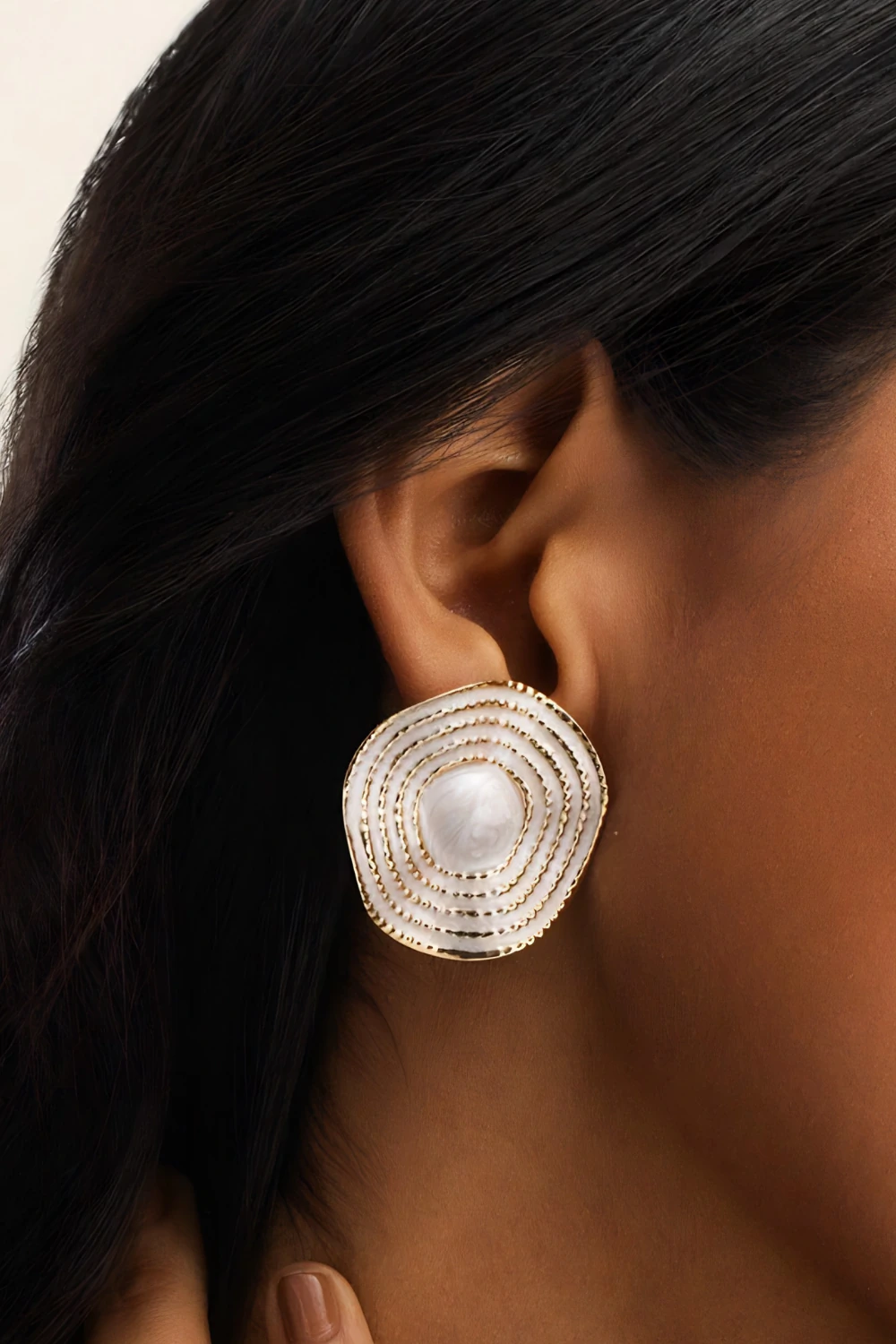 Brinco dourado círculo com design orgânico de ondas, finalizado com resina madrepérola que ilumina a peça com um brilho suave. Um acessório elegante e versátil, perfeito para valorizar produções do dia a dia ou compor looks sofisticados.