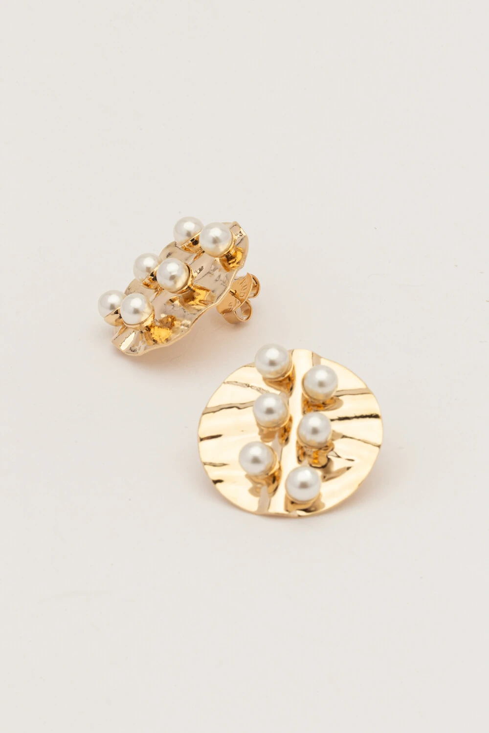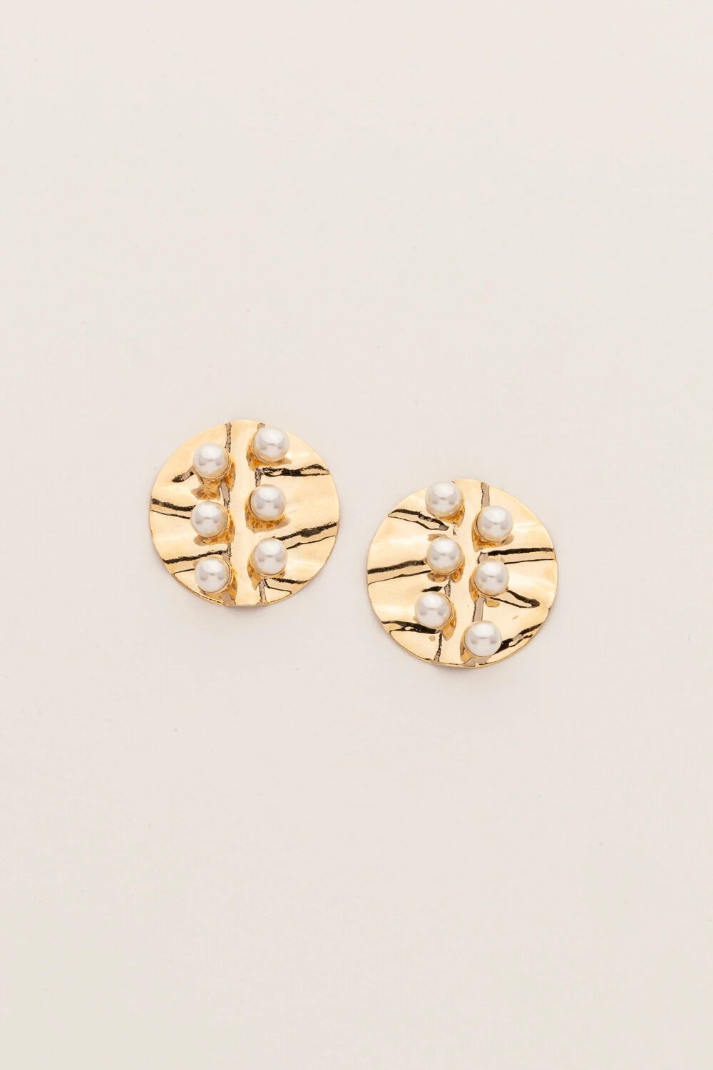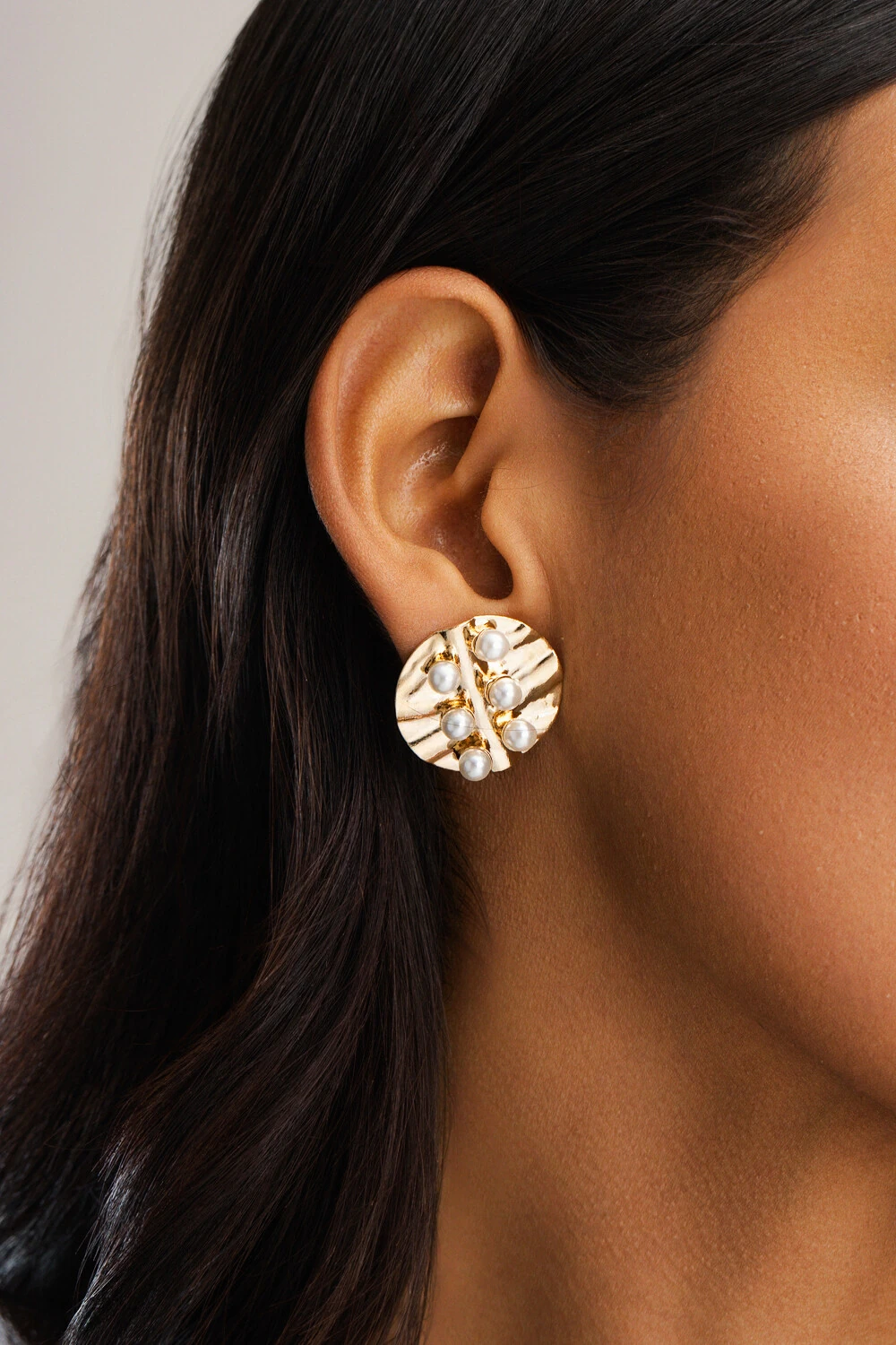 Brinco dourado placa circular martelado, trazendo textura artesanal e brilho sofisticado. Finalizado com pérola sintética, combina delicadeza e modernidade em uma peça versátil para qualquer ocasião.