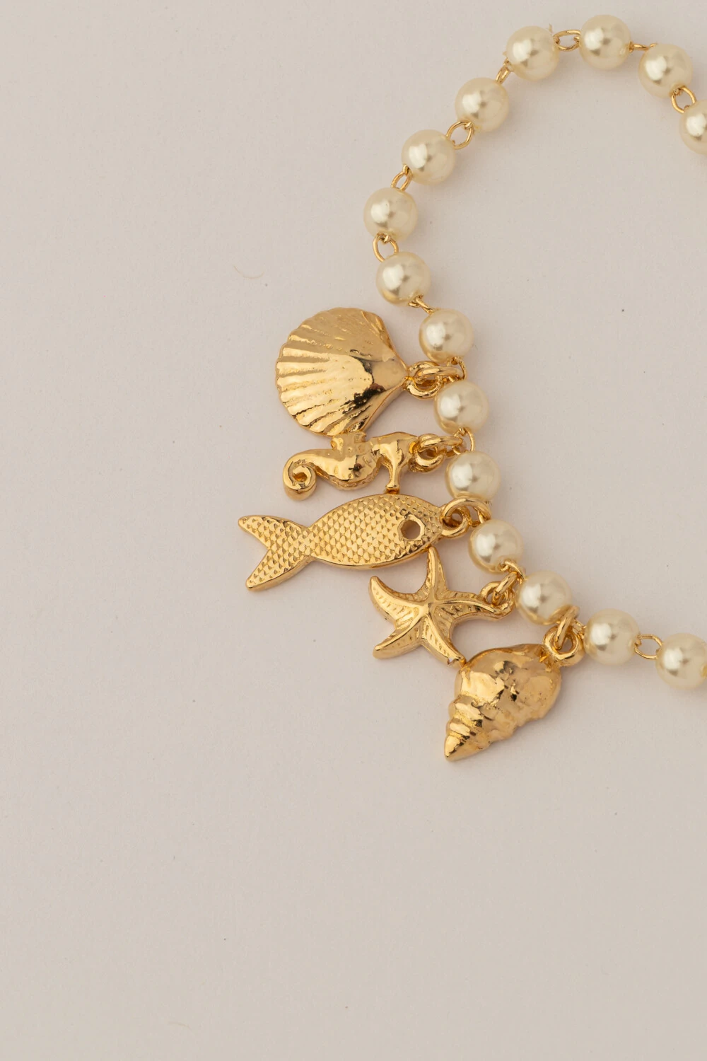 Pulseira dourado com pérolas sintéticas e pingentes temáticos do mar, trazendo charme e frescor à produção. Uma peça versátil, ideal para iluminar o visual com um toque náutico sofisticado.