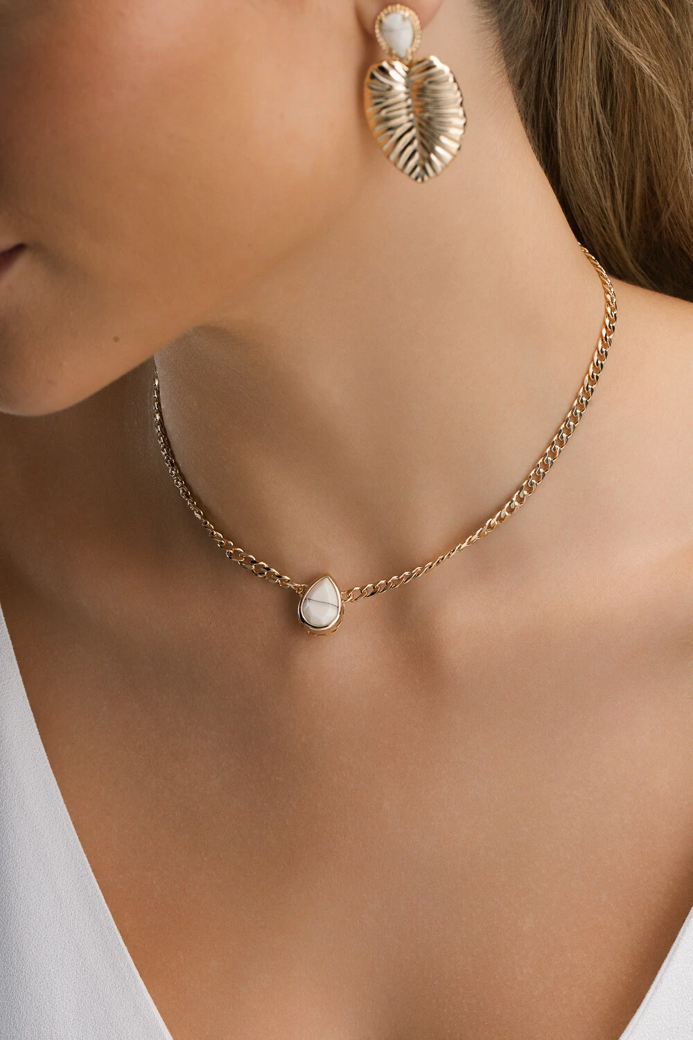 Colar choker corrente elos dourados com pingente gota em resina off white. Versátil e elegante, é perfeita para usar sozinha em propostas minimalistas ou combinada com outros colares para um mix moderno e estiloso.