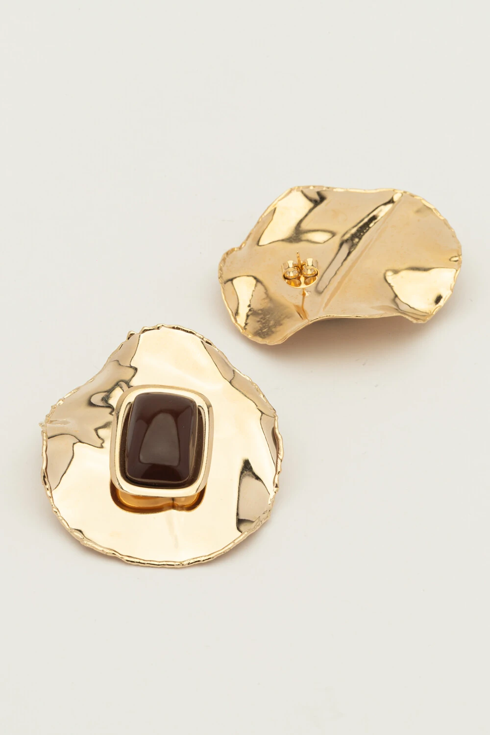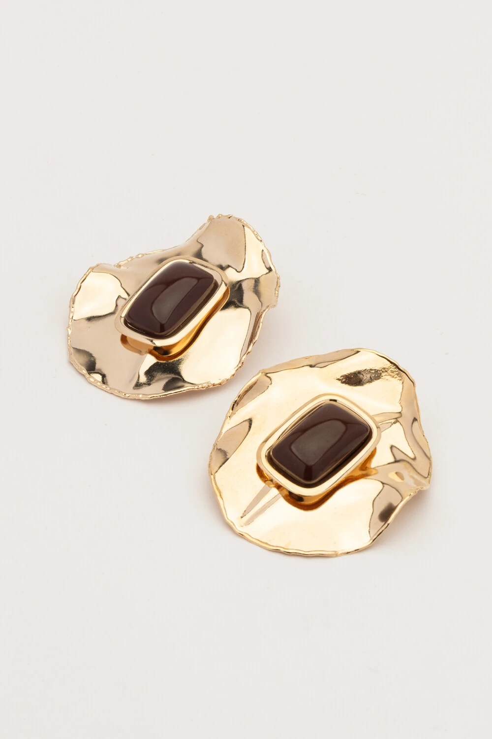 Brinco dourado em placa martelada tamanho G, com acabamento orgânico e brilho sofisticado. O detalhe em resina marrom escuro adiciona profundidade e elegância, criando um contraste moderno e atemporal. Leve, versátil e perfeito para elevar produções do dia a dia ou compor looks mais refinados. Ideal para quem busca um acessório marcante e cheio de personalidade.