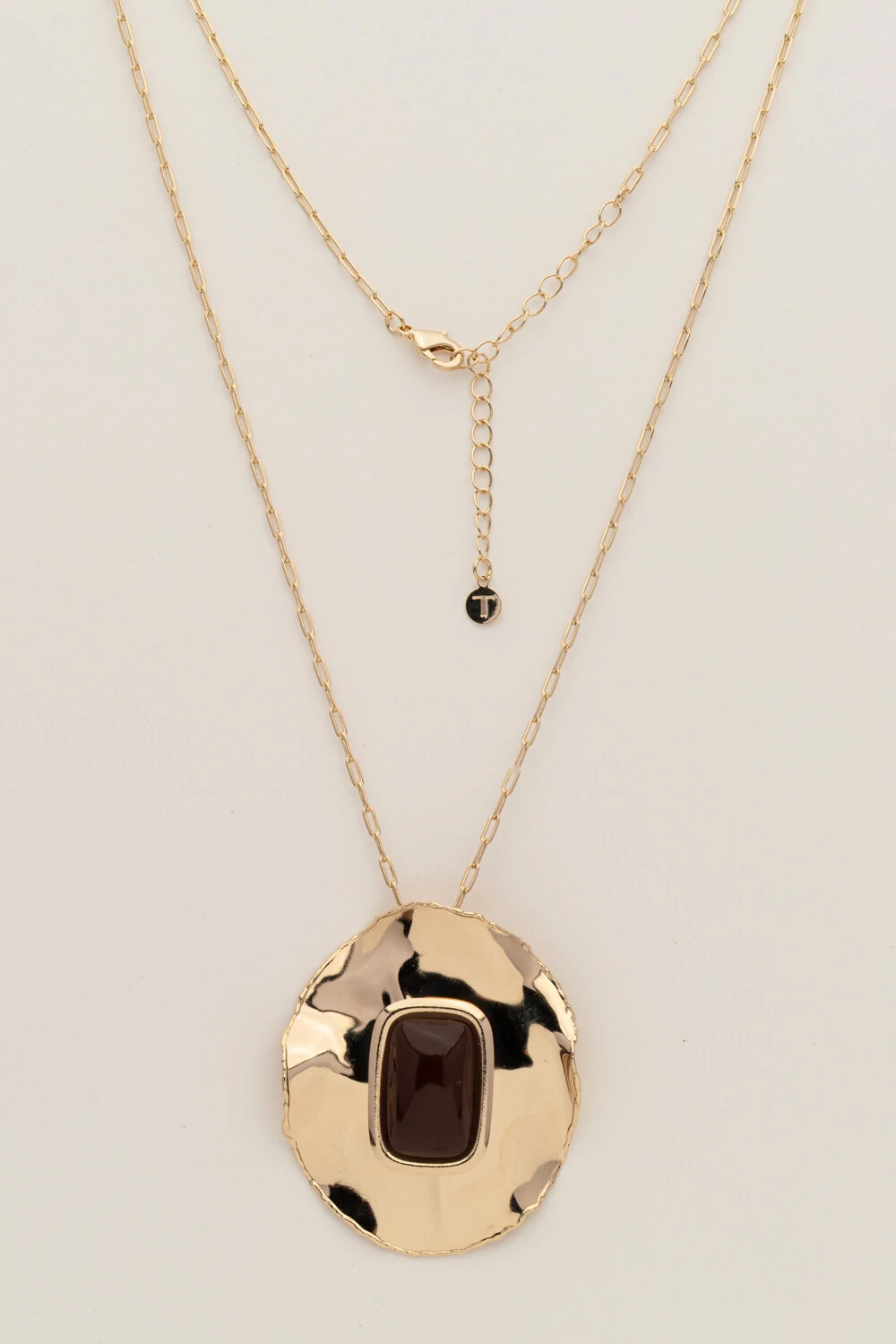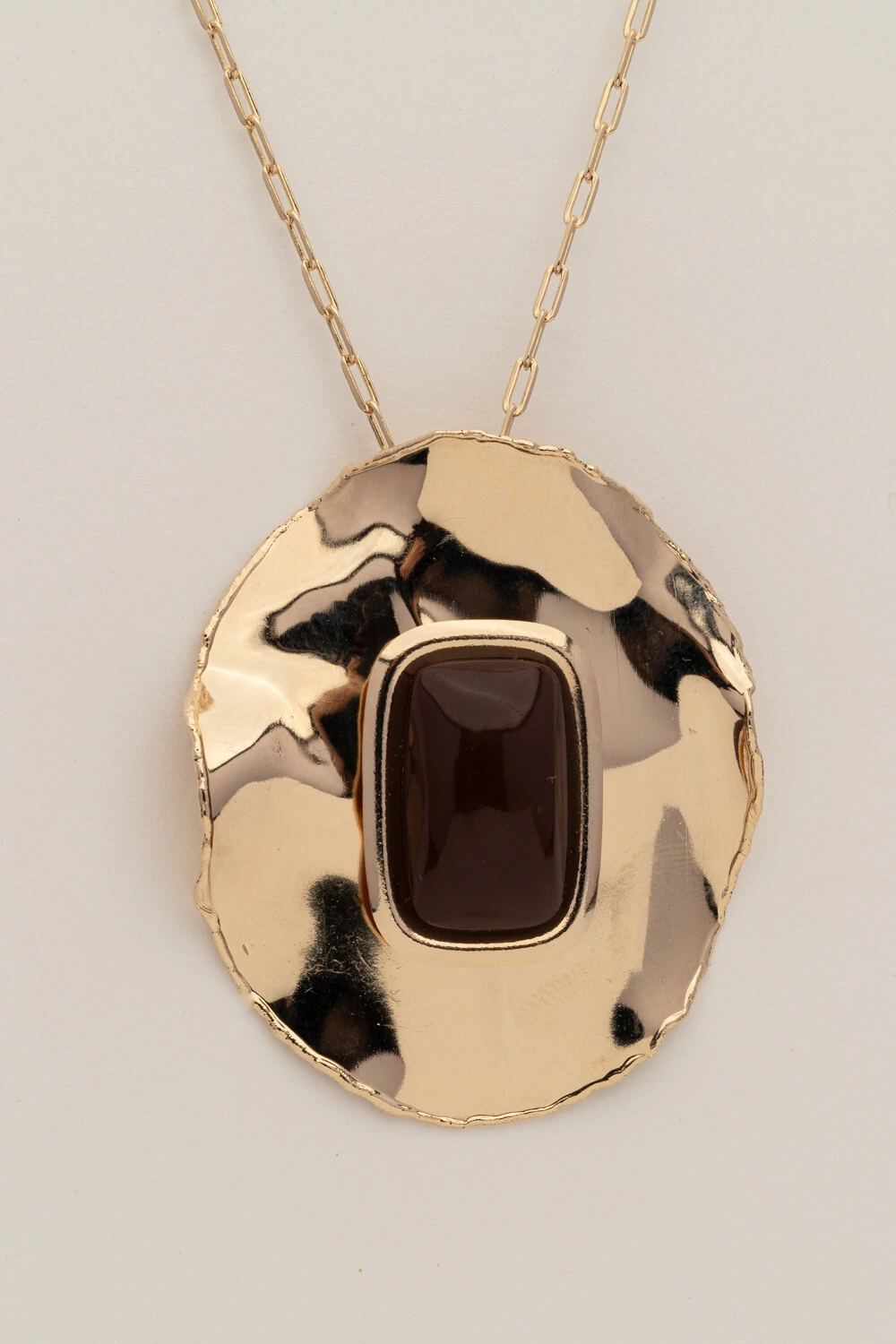 Colar longo dourado com corrente de elos modernos e pingente em placa G com resina marrom escuro, que traz um toque sofisticado e contemporâneo. O contraste entre o metal e a resina cria um visual marcante, perfeito para complementar produções do dia a dia ou looks mais elaborados. Uma peça versátil, com acabamento refinado e presença elegante.