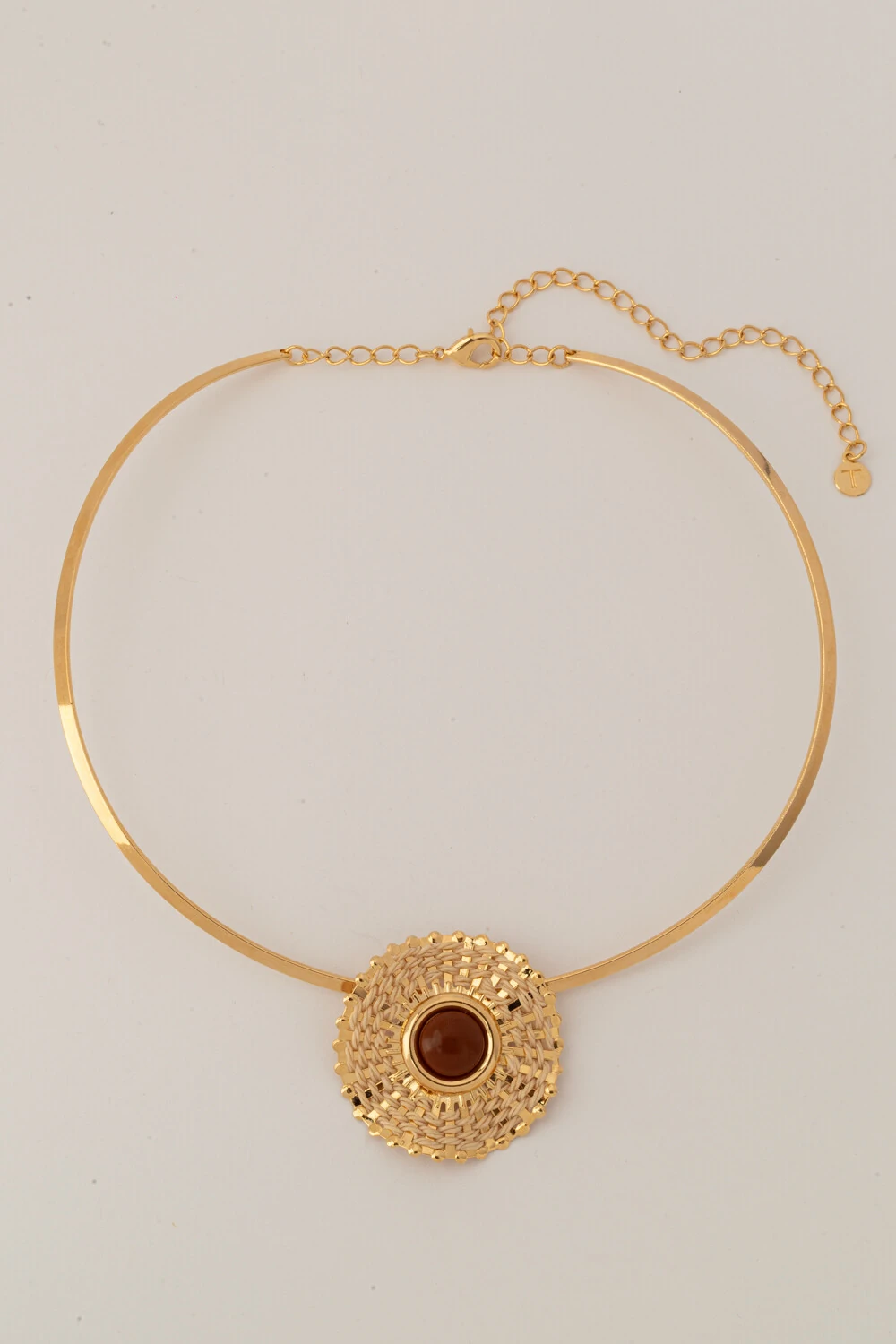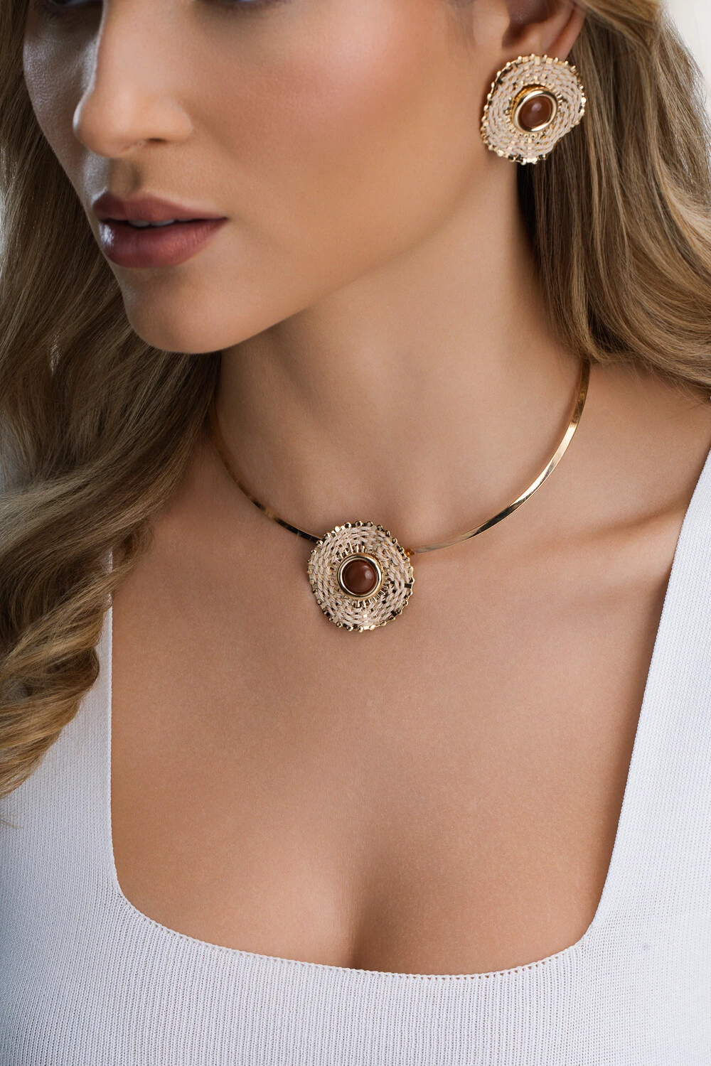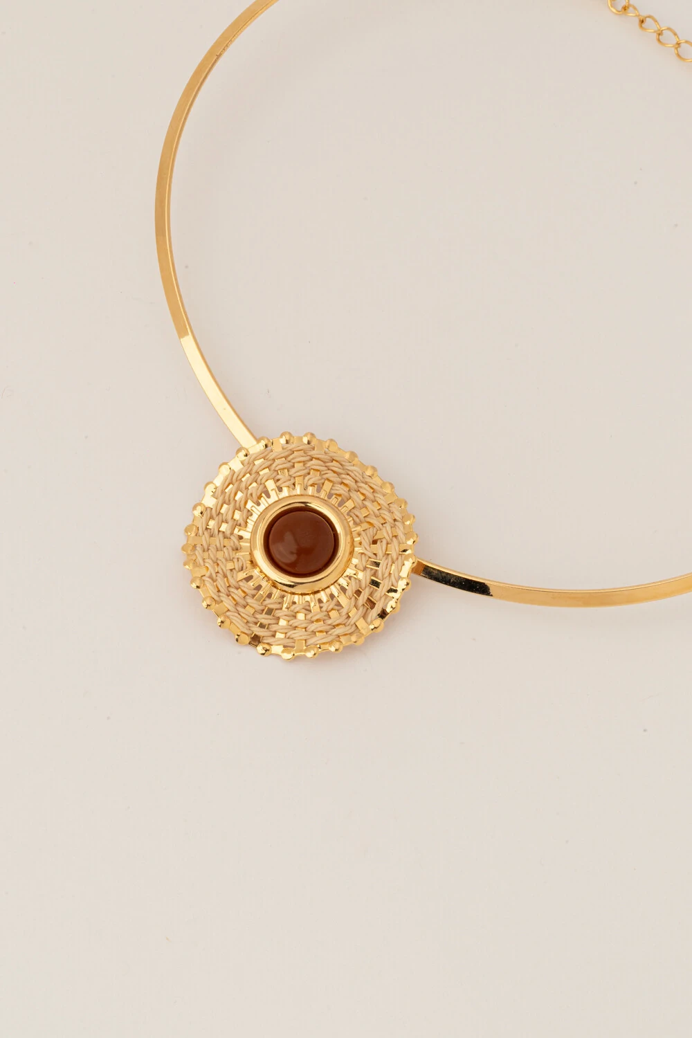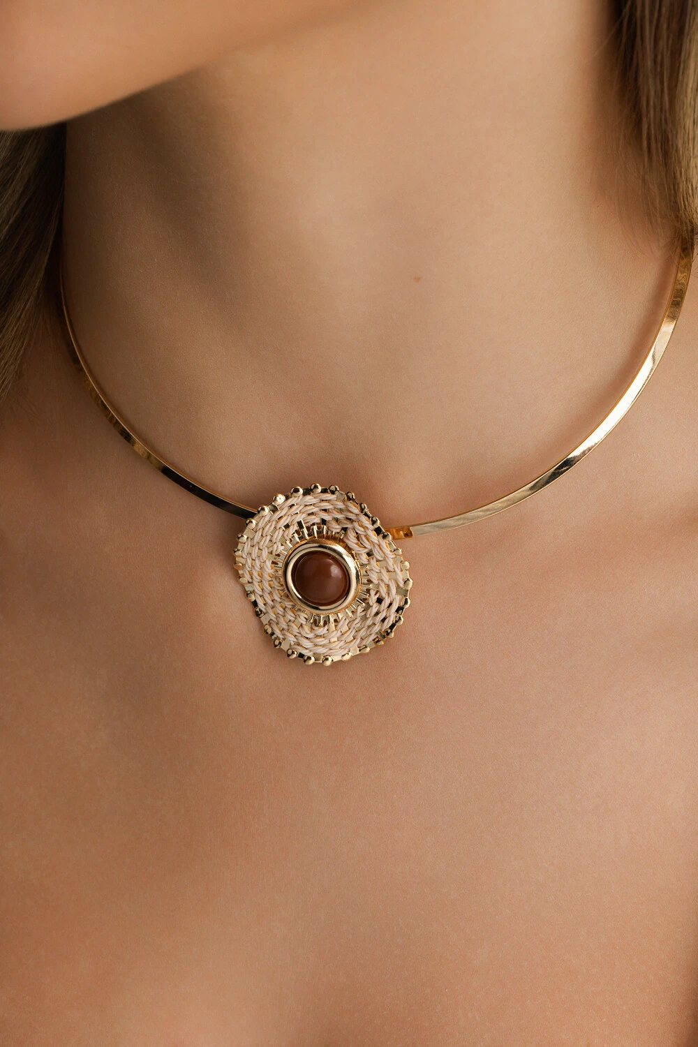 Colar aro dourado, acompanhado de pingente em formato de círculo com palha natural e resina marrom. A mistura de texturas cria um visual elegante e contemporâneo, trazendo leveza e sofisticação à peça. Perfeito para destacar produções do dia a dia ou compor looks mais estilosos com um toque artesanal.