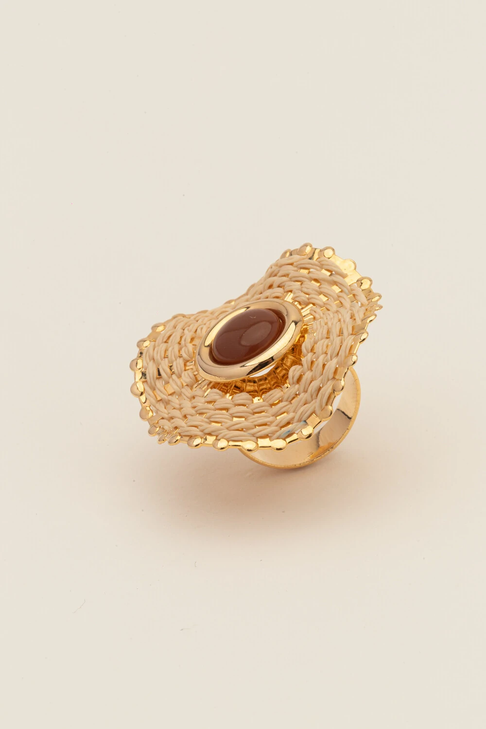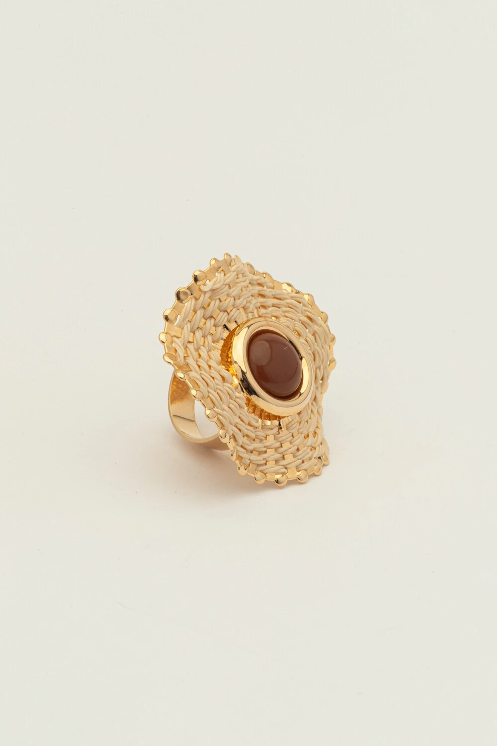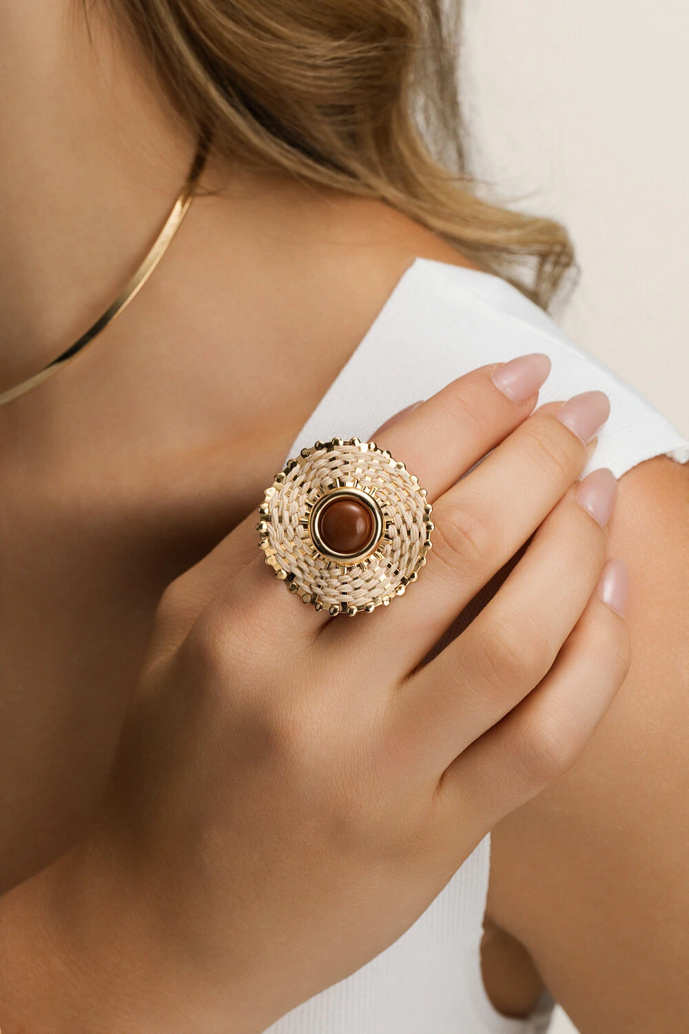 Anel dourado com circulo em palha um toque artesanal elegante. O detalhe em resina marrom escuro adiciona profundidade e modernidade ao design. Ajustável, confortável e cheio de personalidade, é a peça ideal para completar produções com estilo e sofisticação.