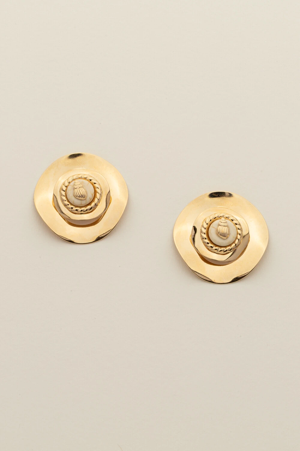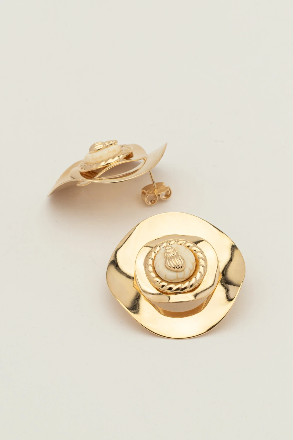 Brinco dourado com placa de formato orgânico, valorizada por pedra de howlita branca e detalhe de concha posicionada ao centro. A combinação cria um contraste natural e elegante, unindo leveza, textura e sofisticação. Uma peça moderna, marcante e perfeita para compor looks com charme artesanal.