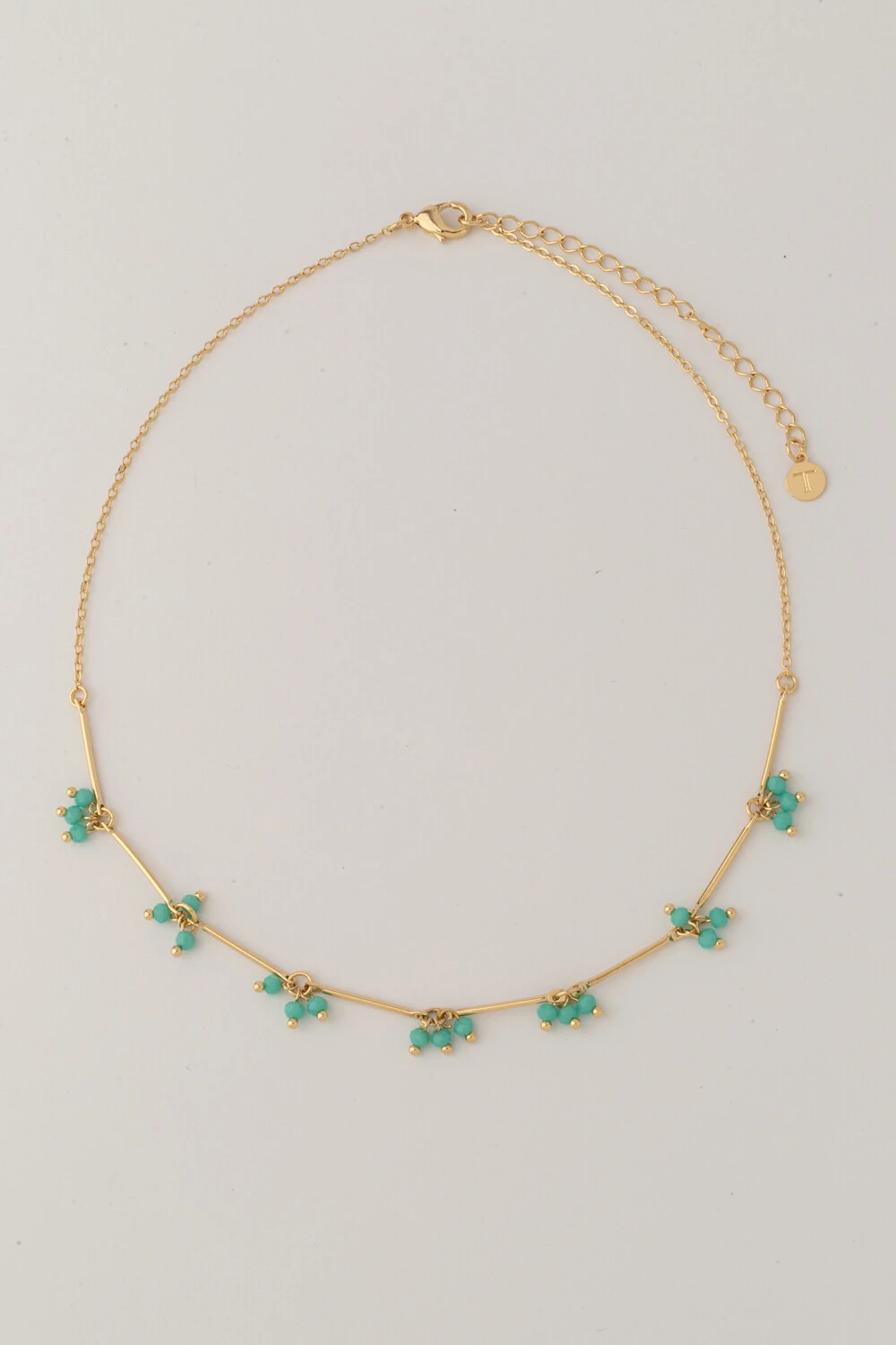 Colar choker composto por palitos dourado delicados, intercalado por cachos de cristais azul, que trazem brilho sutil e um toque moderno à peça. O movimento dos cristais adiciona leveza e elegância, criando um visual sofisticado e cheio de frescor. Ideal para iluminar produções do dia a dia ou compor looks mais elaborados com um charme extra.