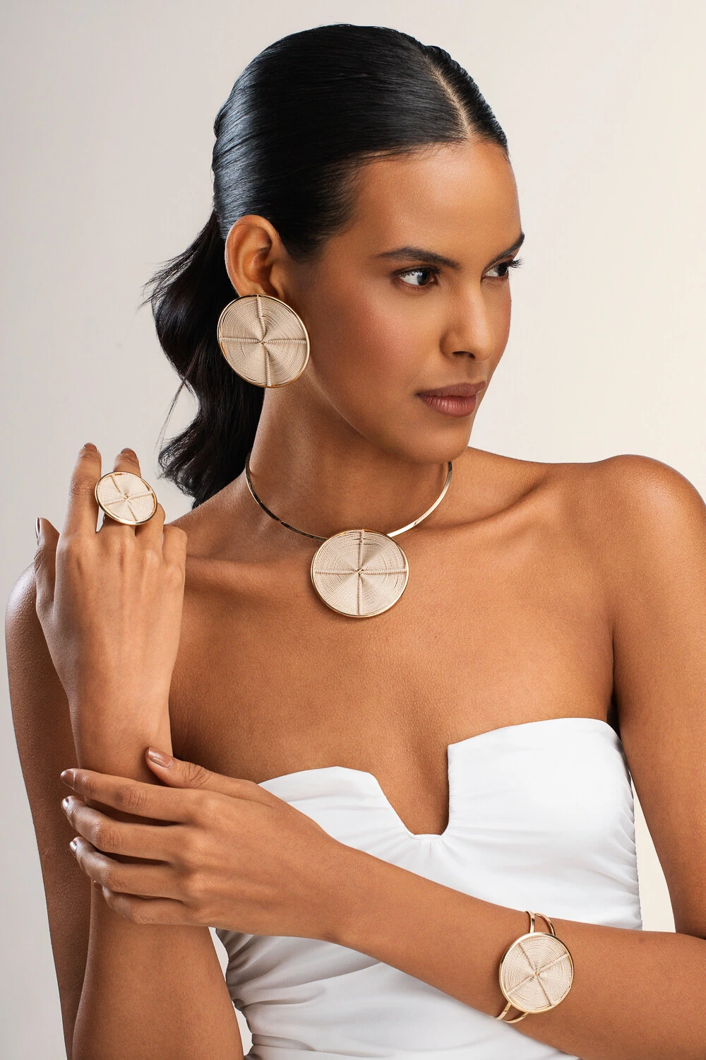 Brinco dourado aro palha, com textura inspirada no trançado natural da palha que traz leveza e estilo ao look. Seu design moderno e sofisticado adiciona um toque artesanal à produção, perfeito para quem busca um acessório marcante, versátil e elegante para o dia a dia ou ocasiões especiais.