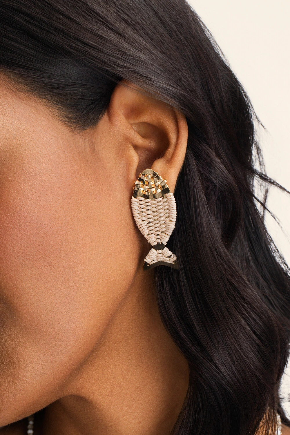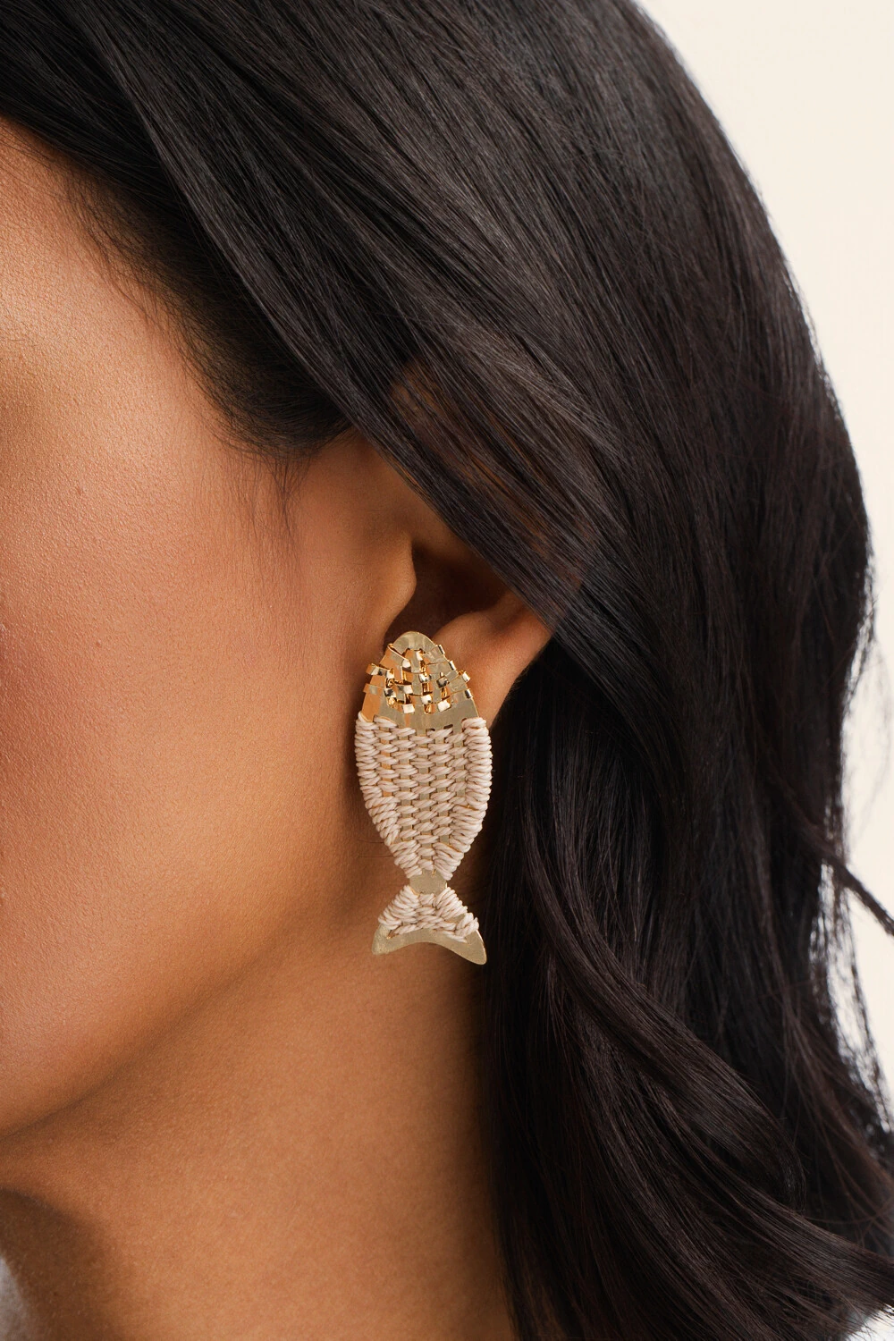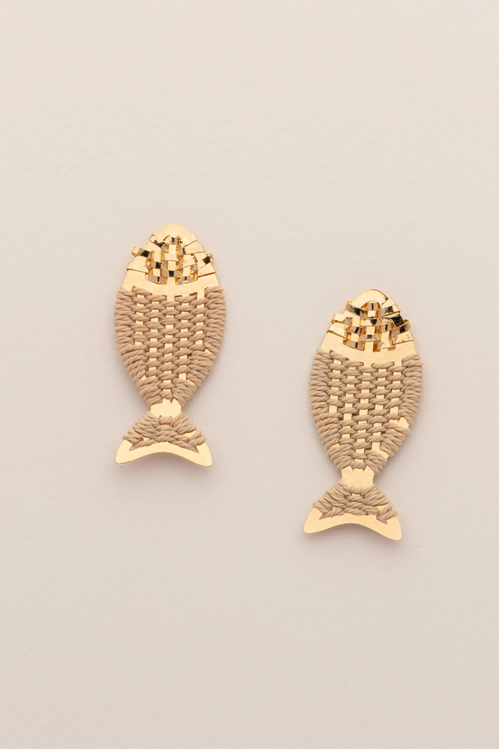 Brinco dourado com detalhe em palha que destaca o desenho orgânico do peixe e traz um charme artesanal ao acessório. Uma peça leve, moderna e cheia de personalidade, perfeita para compor looks praianos, casuais ou sofisticados com um toque natural e elegante.