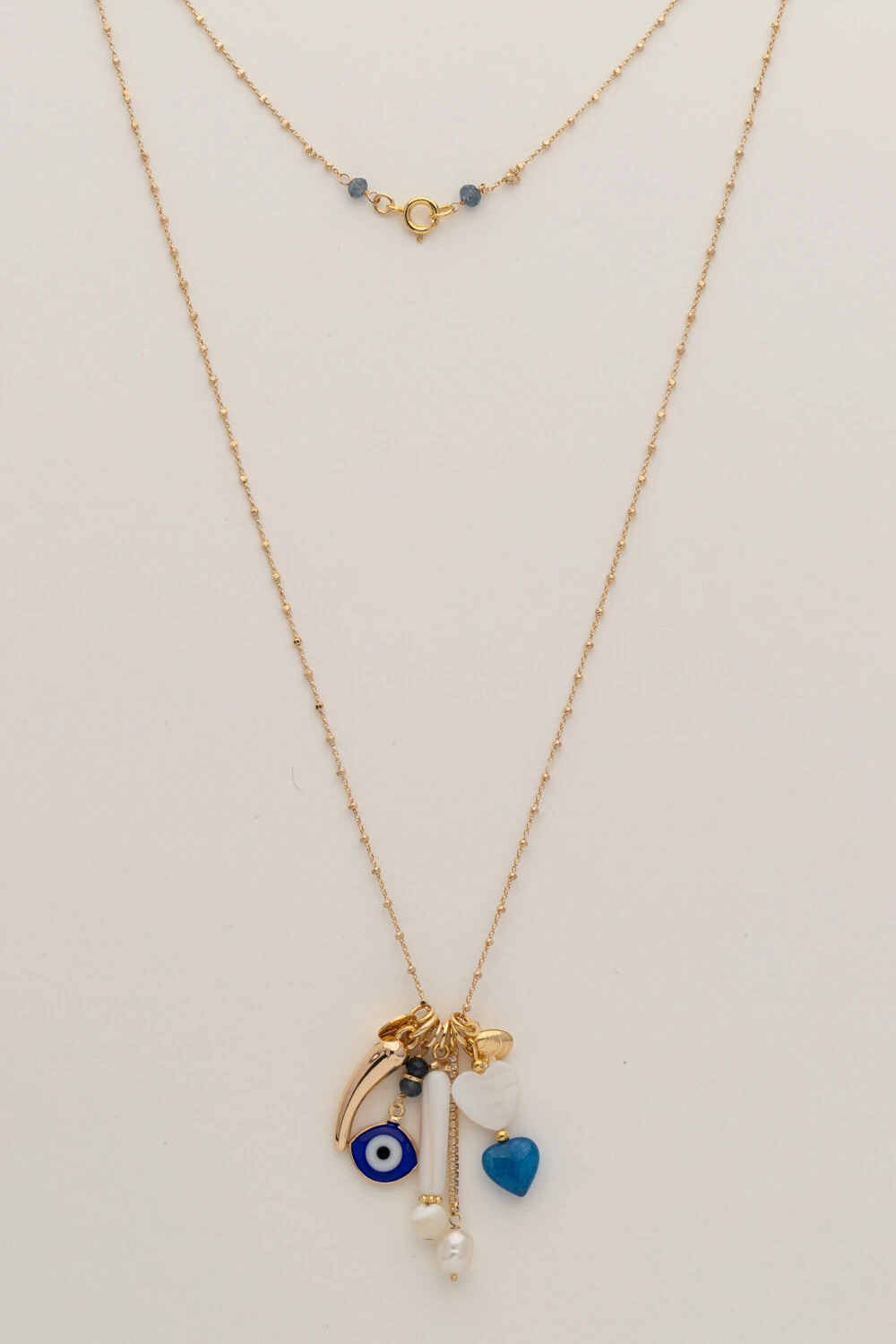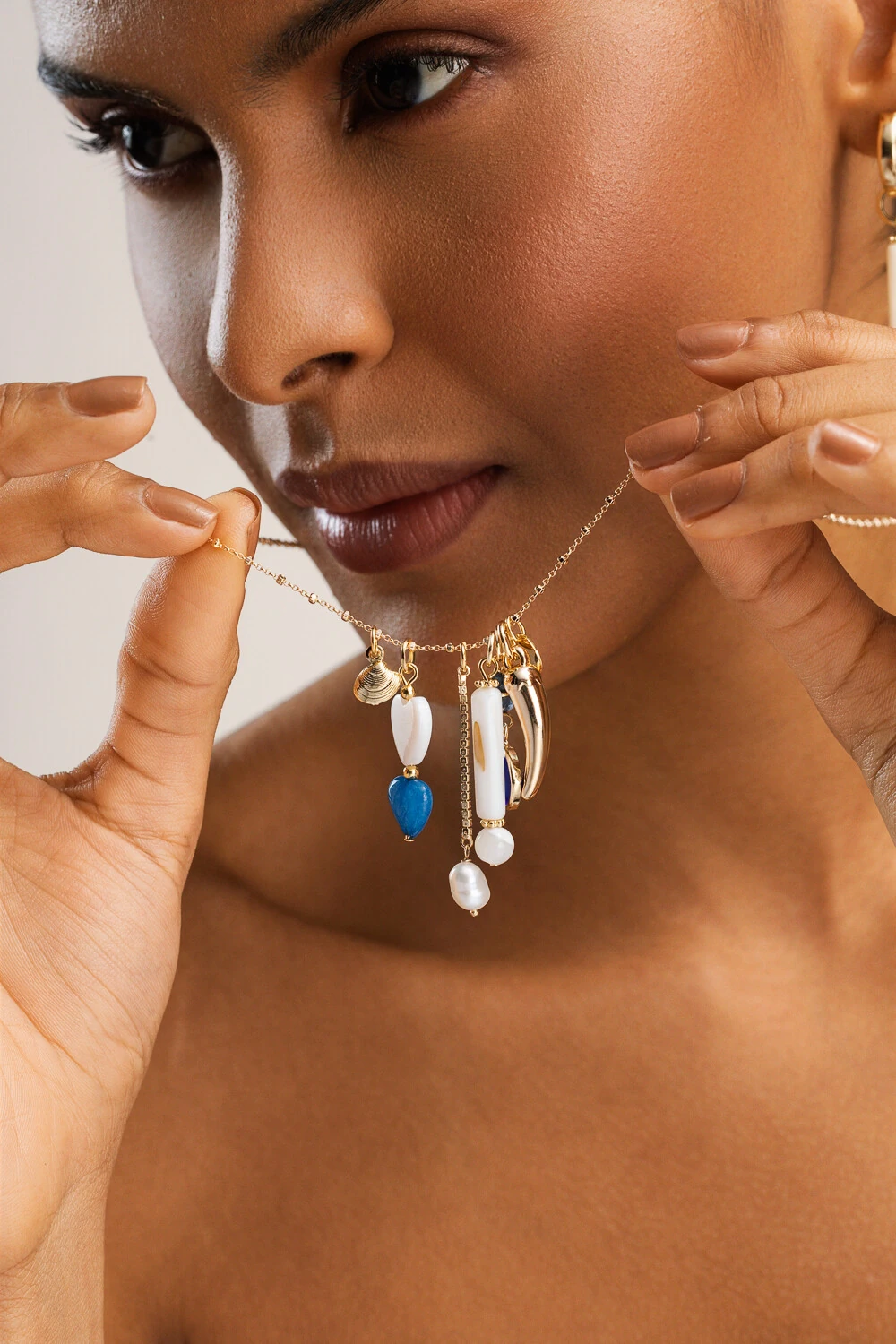 Colar longo, corrente com micro bolinhas e um mix de pingentes compostos por madre pérola, fio de zircônia, pérolas naturais, dente metal liso e olho grego. Perfeito para usar sozinho como peça de destaque ou em composições modernas com outros colares, trazendo personalidade e charme para qualquer produção.