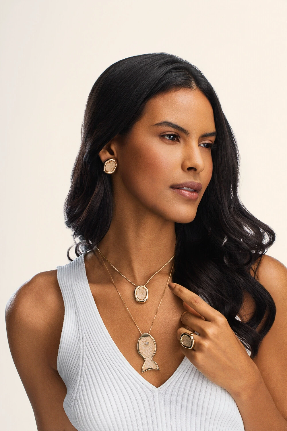 Colar Dourado Plaquinhas Cristais Off White