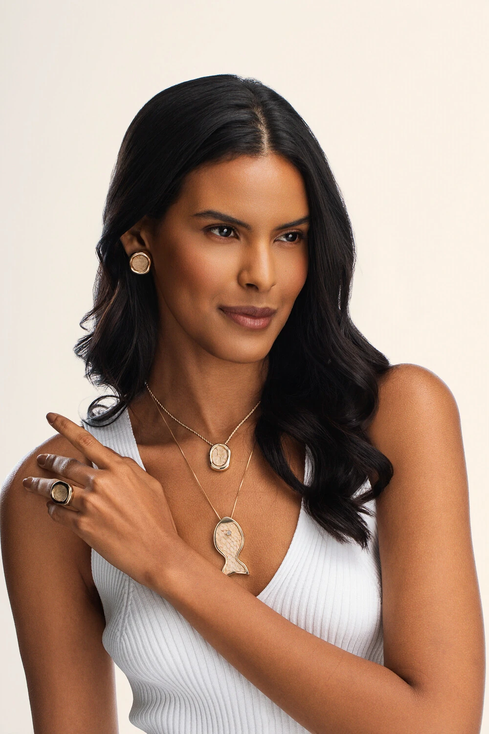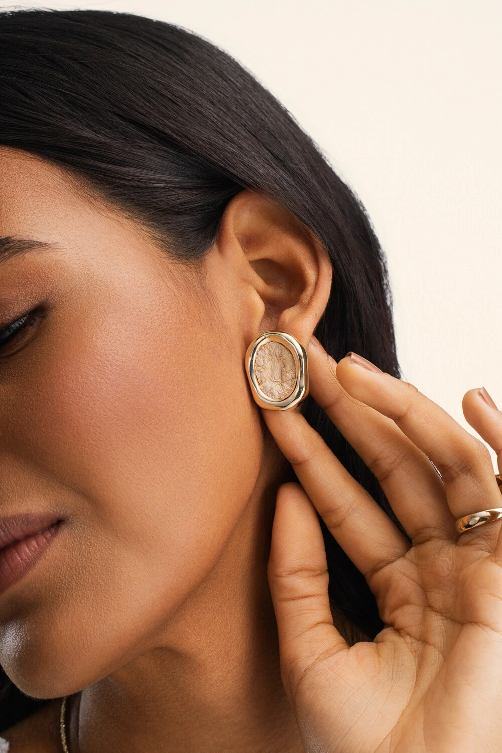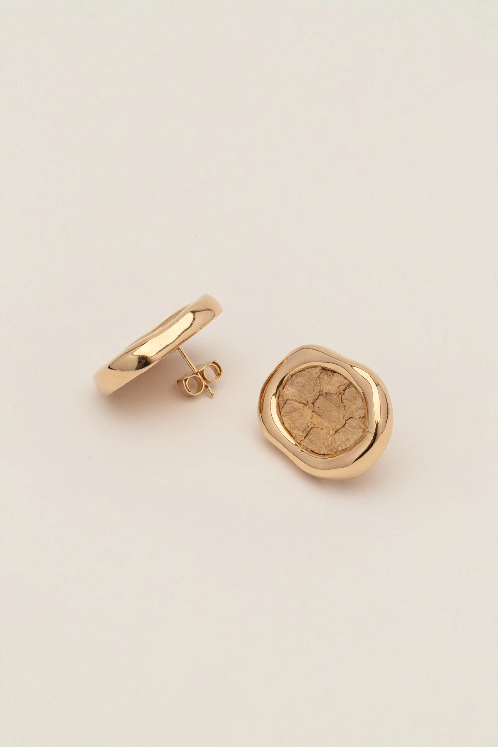 Brinco dourado formato orgânico em couro de Tilápia Ecológico uma peça cheia de autenticidade, com design artesanal e rústico. Perfeito para quem busca acessórios diferenciados. Leve, versátil e marcante, o brinco complementa desde produções casuais até looks mais elaborados.