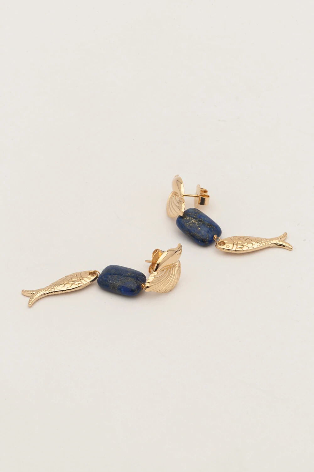 Brinco peixe autoral banho ouro 18k, com Lápis-Lazúli. Design em formato de peixe traz leveza e movimento, perfeito para quem busca um toque artesanal e simbólico na composição.