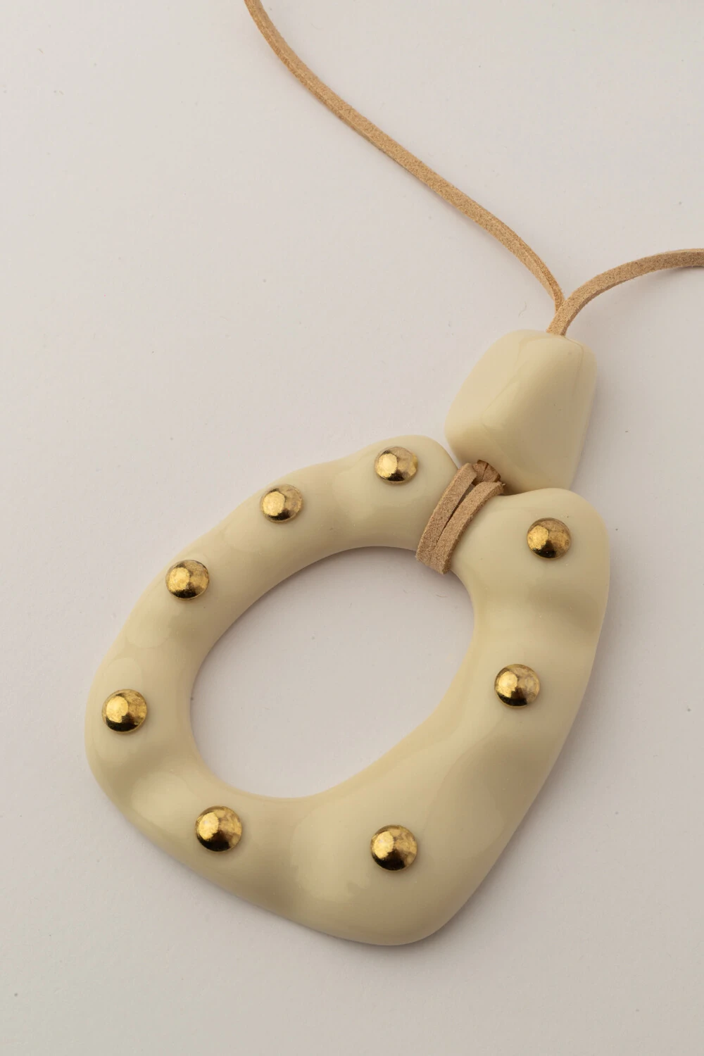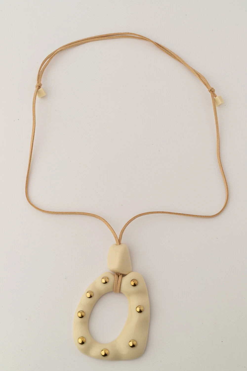 Com design artesanal e toque contemporâneo, este colar combina resina em formato orgânico com couro nude, criando um contraste sofisticado. As tachinhas douradas adicionam brilho e atitude, tornando a peça moderna e marcante. Ideal para elevar produções básicas ou complementar looks cheios de personalidade.