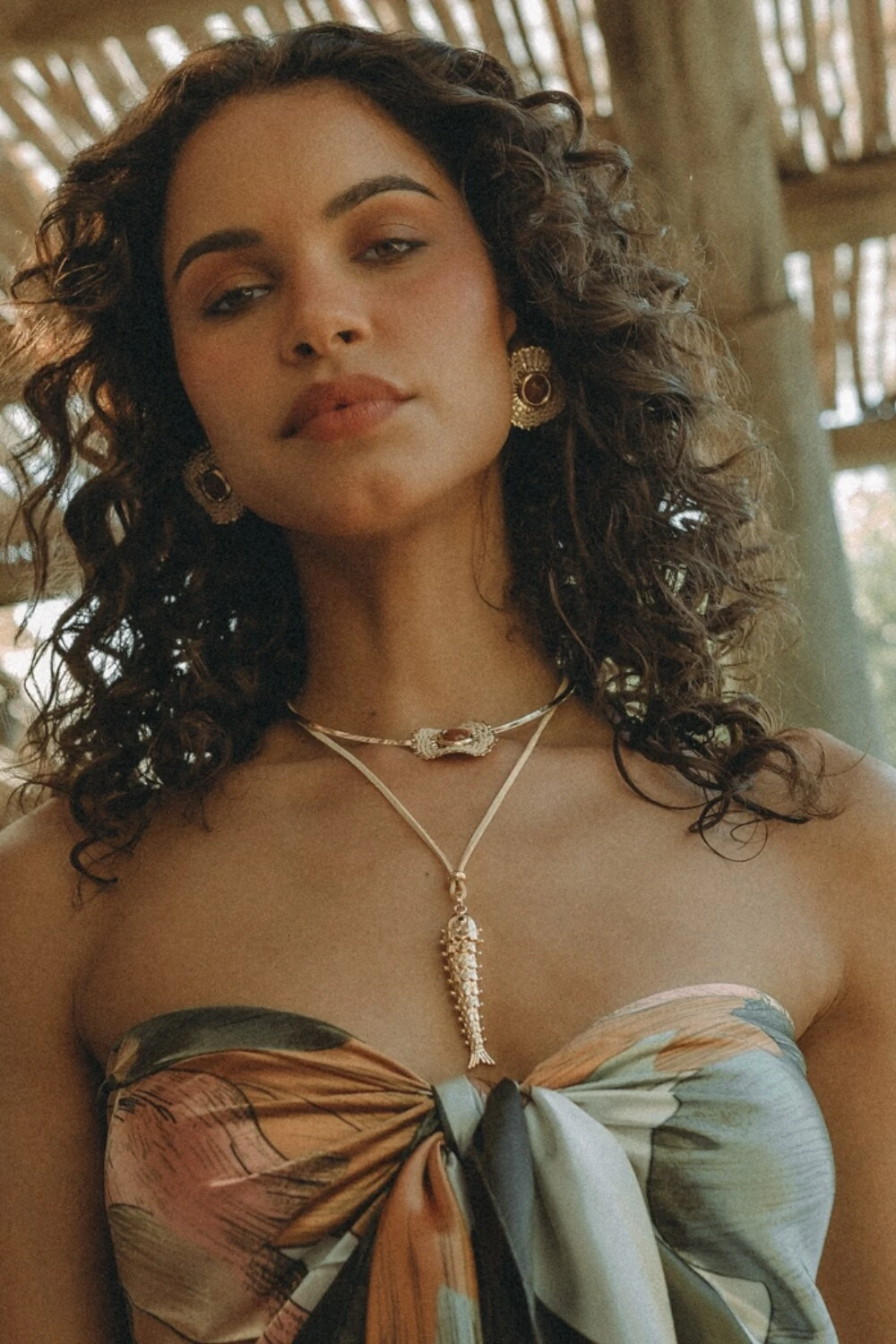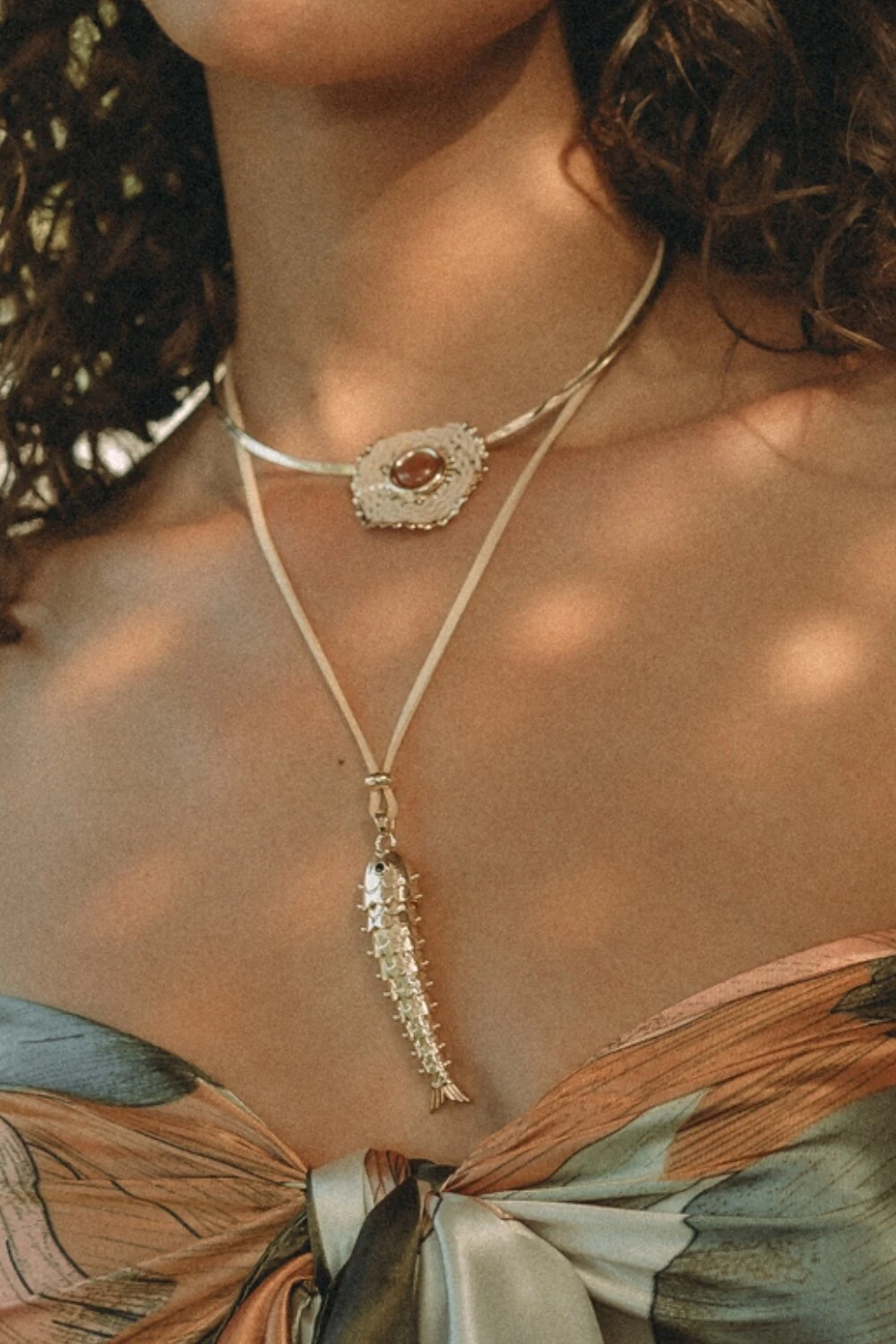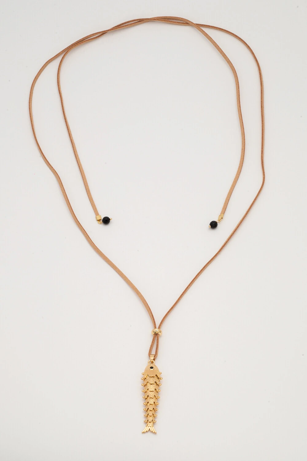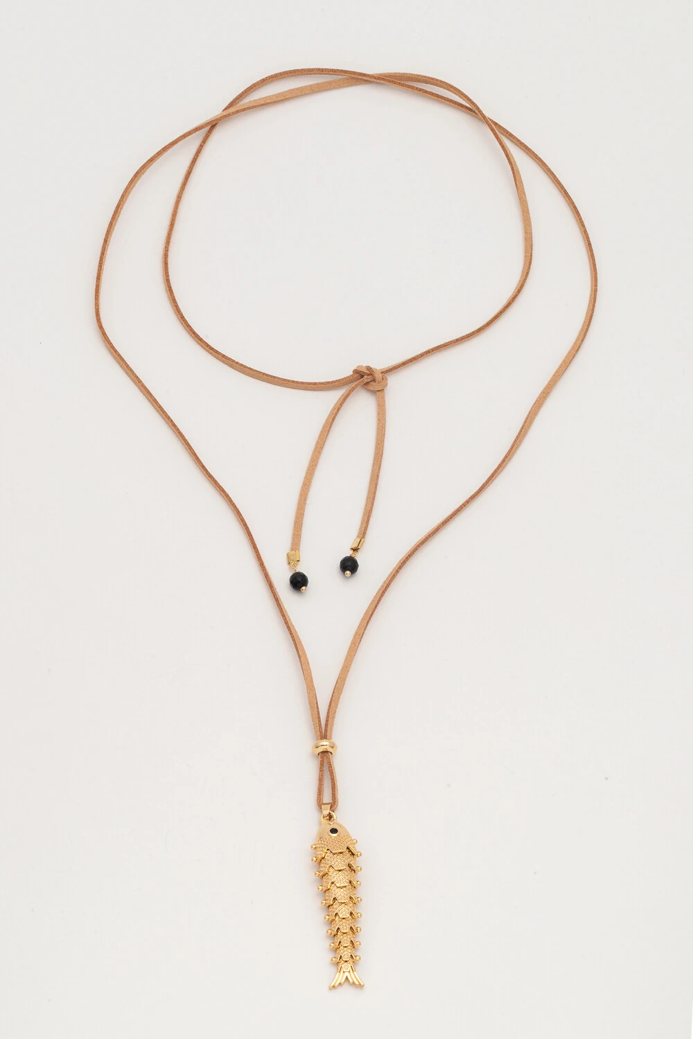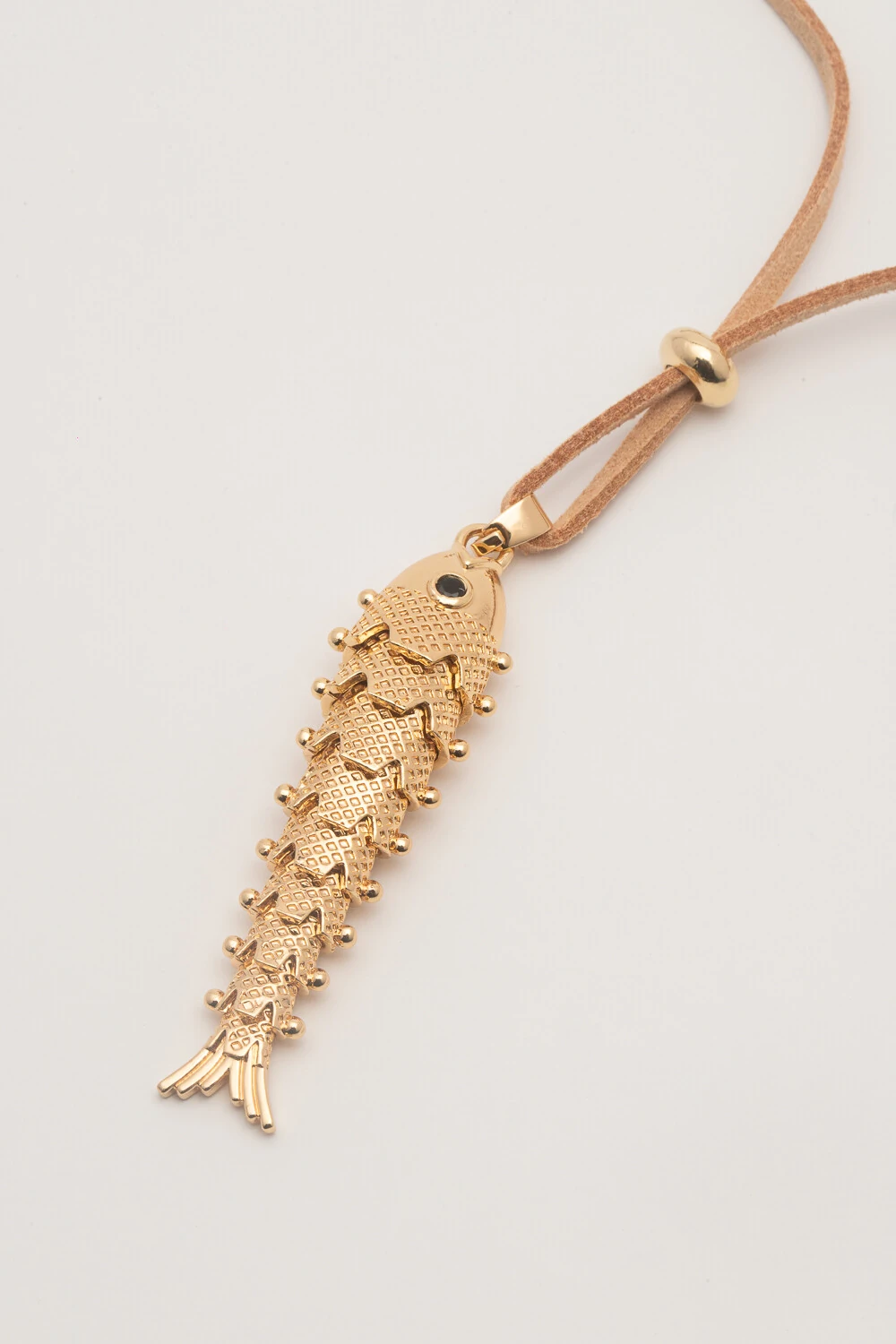 Colar com design contemporâneo e inspiração orgânica, composto por cordão em camurça que garante conforto e versatilidade ao uso. O destaque fica por conta do pingente de peixe dourado, com acabamento maleável e formas fluidas, que traz movimento e leveza à peça, ideal para compor produções modernas, do casual ao sofisticado, adicionando um toque artístico e diferenciado ao visual.
