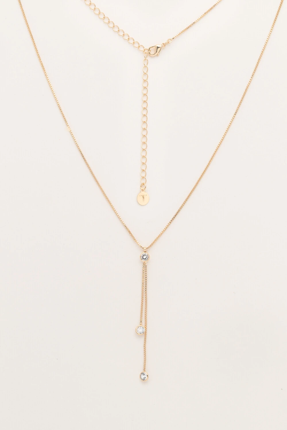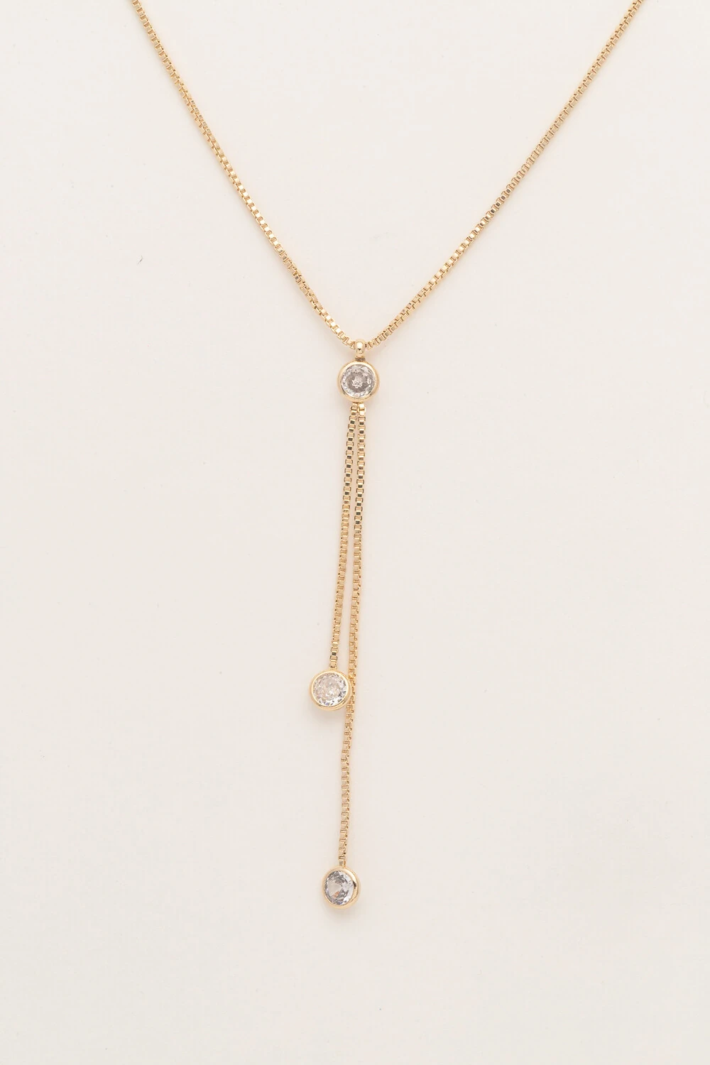 Colar gravata 3 zircônias e corrente veneziana banho Ouro 18K. Perfeito para quem busca um acessório versátil que pode ser usado sozinho como destaque ou combinado com outros colares para looks mais elaborados.
