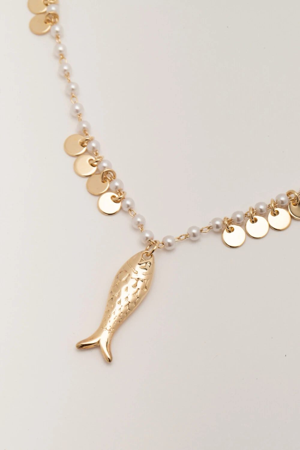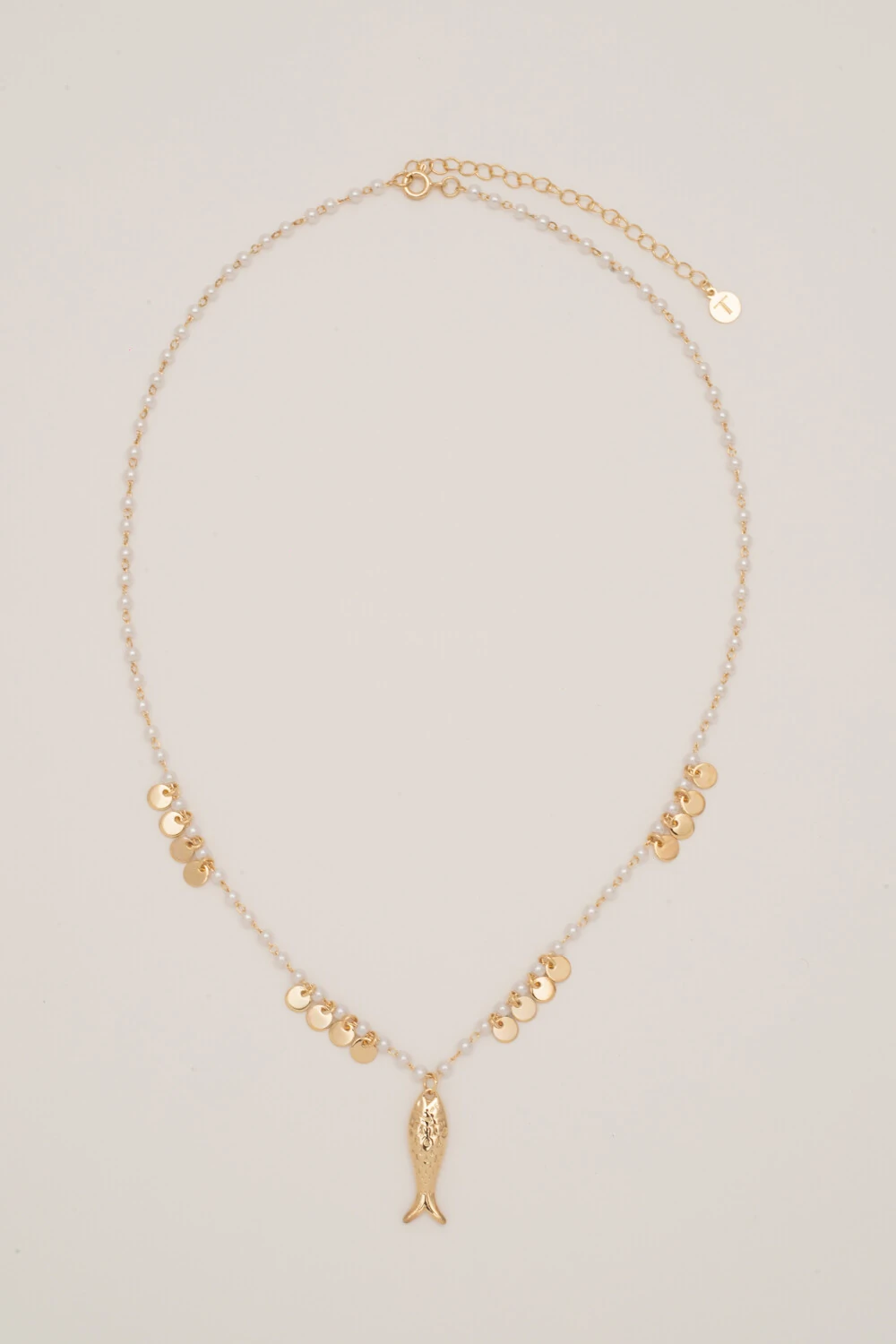 Colar dourado com pérolas sintéticas, plaquinhas metal liso e pingente peixe. Uma peça versátil, ideal para iluminar o visual com um toque náutico sofisticado.