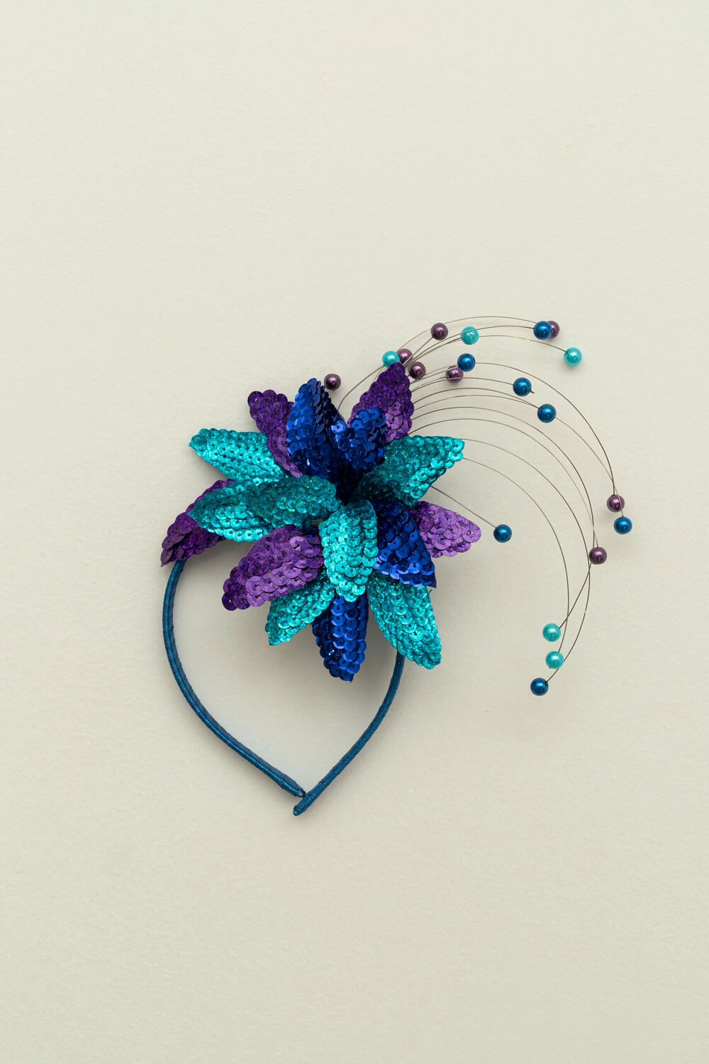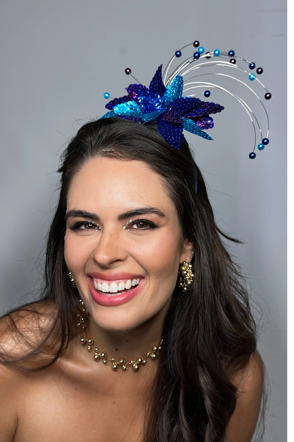 Tiara com arco azul fita seda e detalhes em folhas paetê azul bic, roxo e turquesa. Que tal dar um charme especial no seu look carnaval?! Deixe a sua criatividade rolar e arrase.