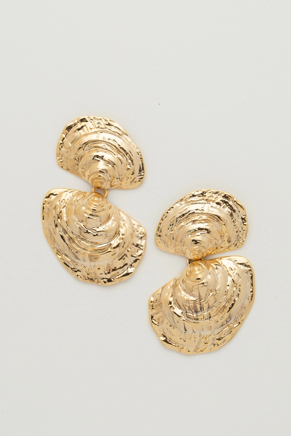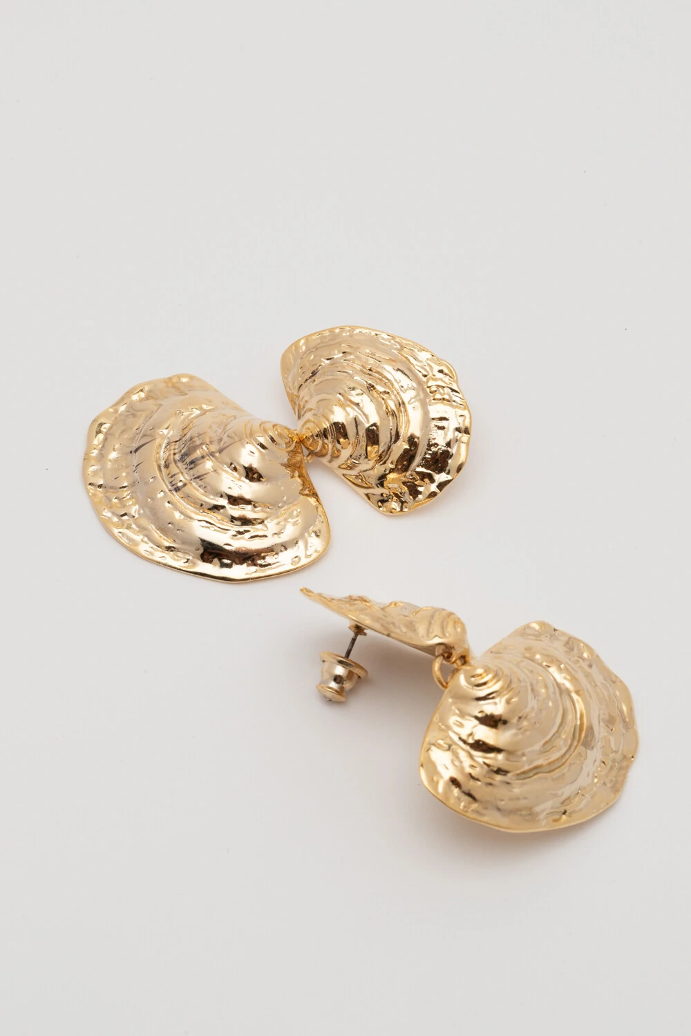 Brinco dourado com design de concha dupla, inspirado nas formas orgânicas do mar. A composição traz elegância e movimento na medida certa, ideal para elevar produções do dia a dia ou complementar looks mais sofisticados. Possui pino em aço cirúrgico, material resistente e hipoalergênico, garantindo conforto e segurança no uso.