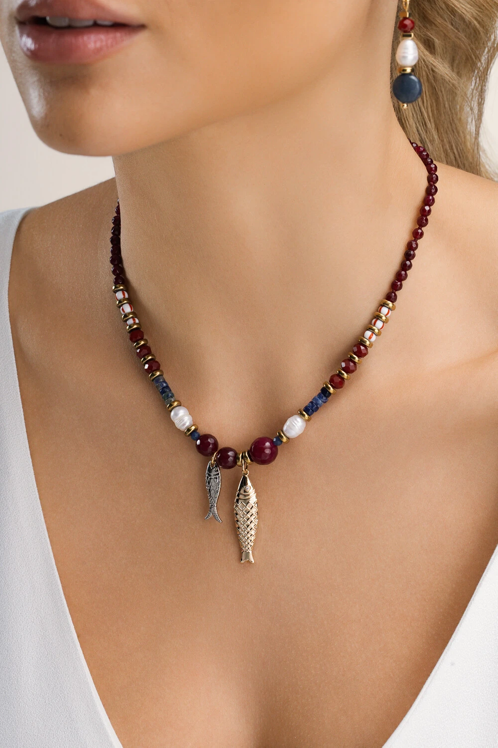 Colar em jade vermelho, com design marcante e elegante. A peça traz dois pingentes, um em tom dourado e outro prateado, criando um contraste moderno e sofisticado que valoriza qualquer produção.