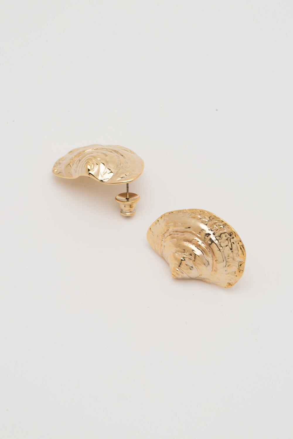 Brinco dourado placa orgânica em formato de concha, acabamento texturizado e brilho intenso. Uma peça marcante, inspirada no movimento do mar e nas formas naturais, perfeita para elevar produções básicas ou compor looks sofisticados com personalidade.