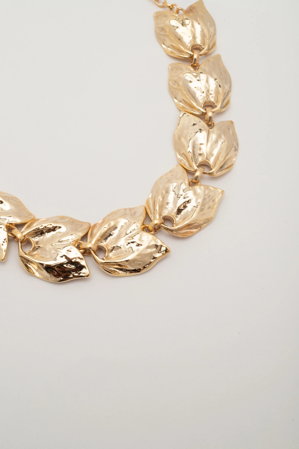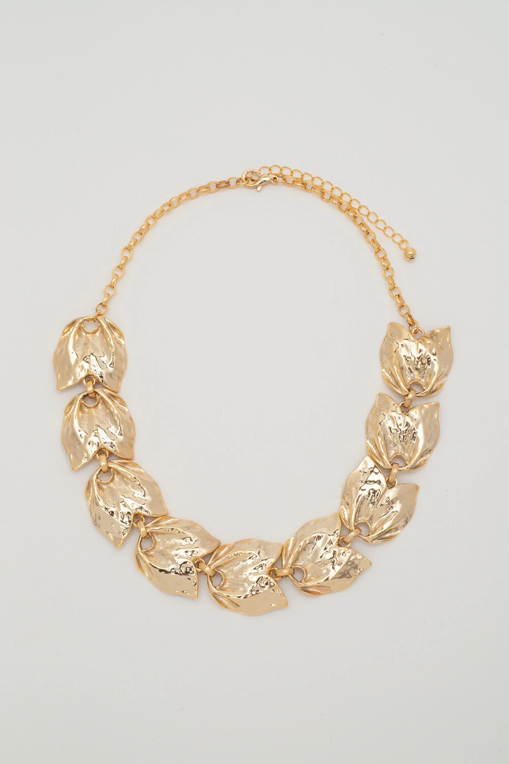 Colar dourado composto por placas inspiradas em tulipas acabamento texturizado com brilho intenso. ideal para destacar o visual.
