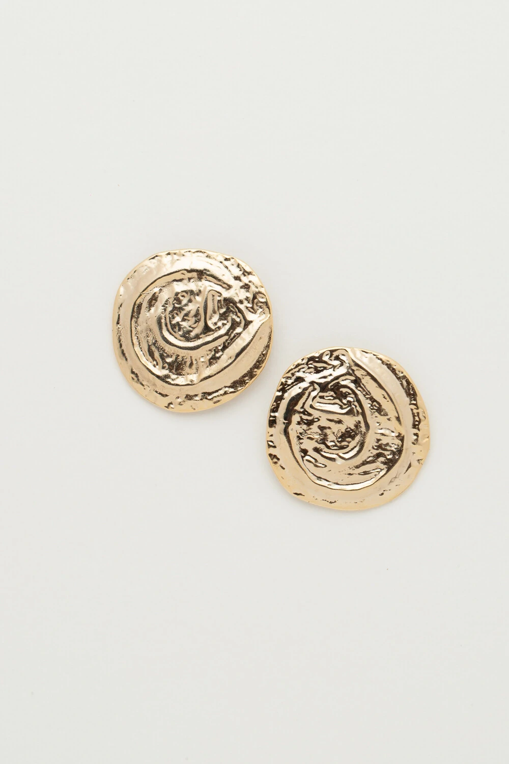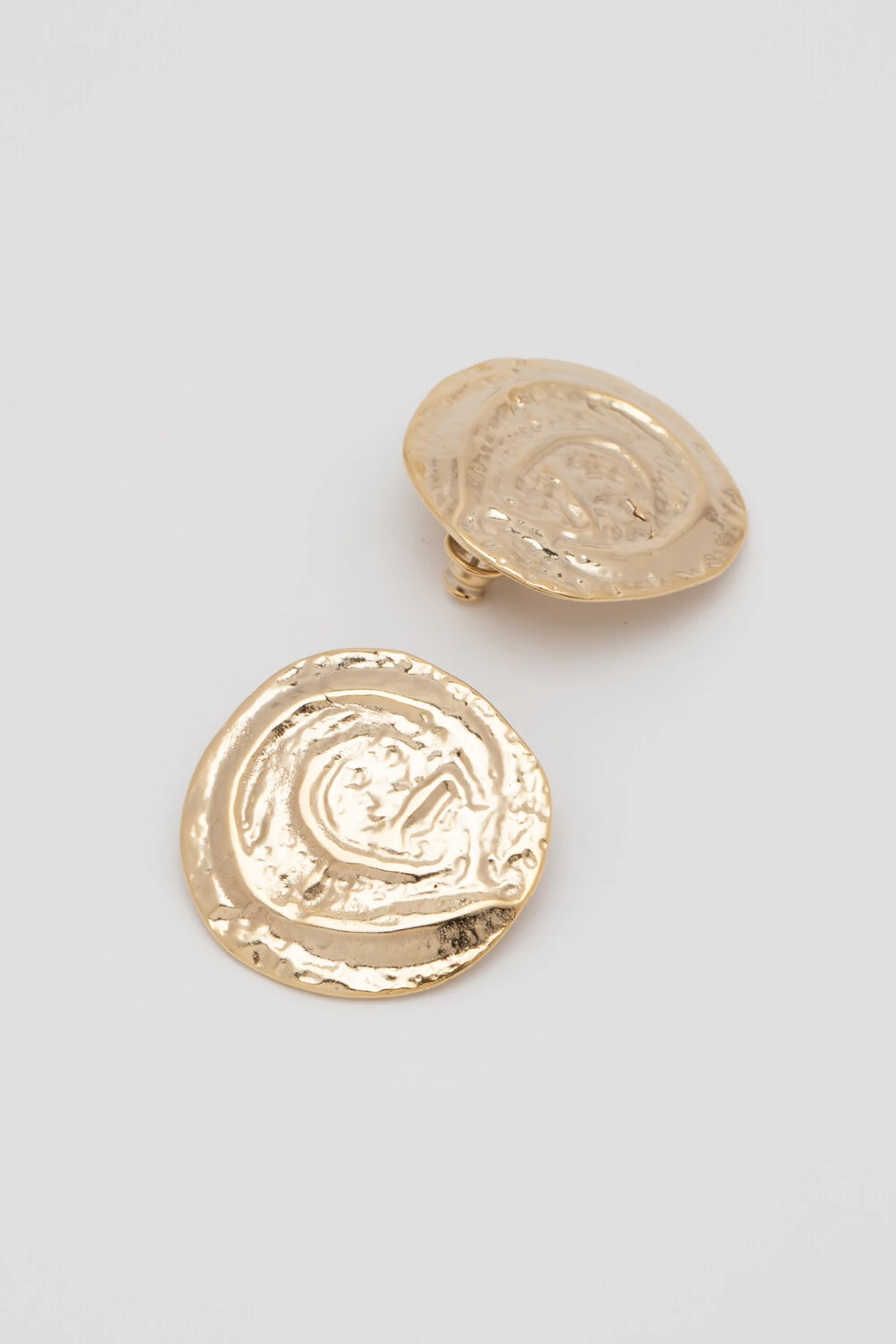 Brinco dourado placa orgânica de acabamento texturizado. As formas irregulares e o brilho intenso criam uma peça marcante, com estética contemporânea e presença forte. Capaz de transformar qualquer produção.