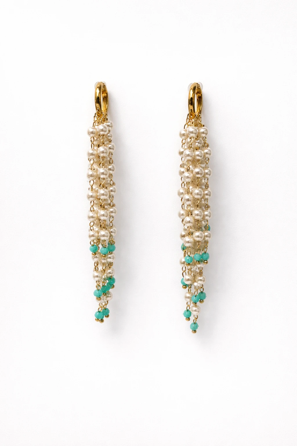 Delicado e sofisticado, o brinco argola dourada com cascata de pérolas sintéticas e turquesa é a escolha perfeita para quem ama um toque clássico com design moderno. A base em argola dourada com fecho click ganha movimento com a aplicação de pérolas em efeito cascata, trazendo leveza, brilho suave e elegância na medida certa.