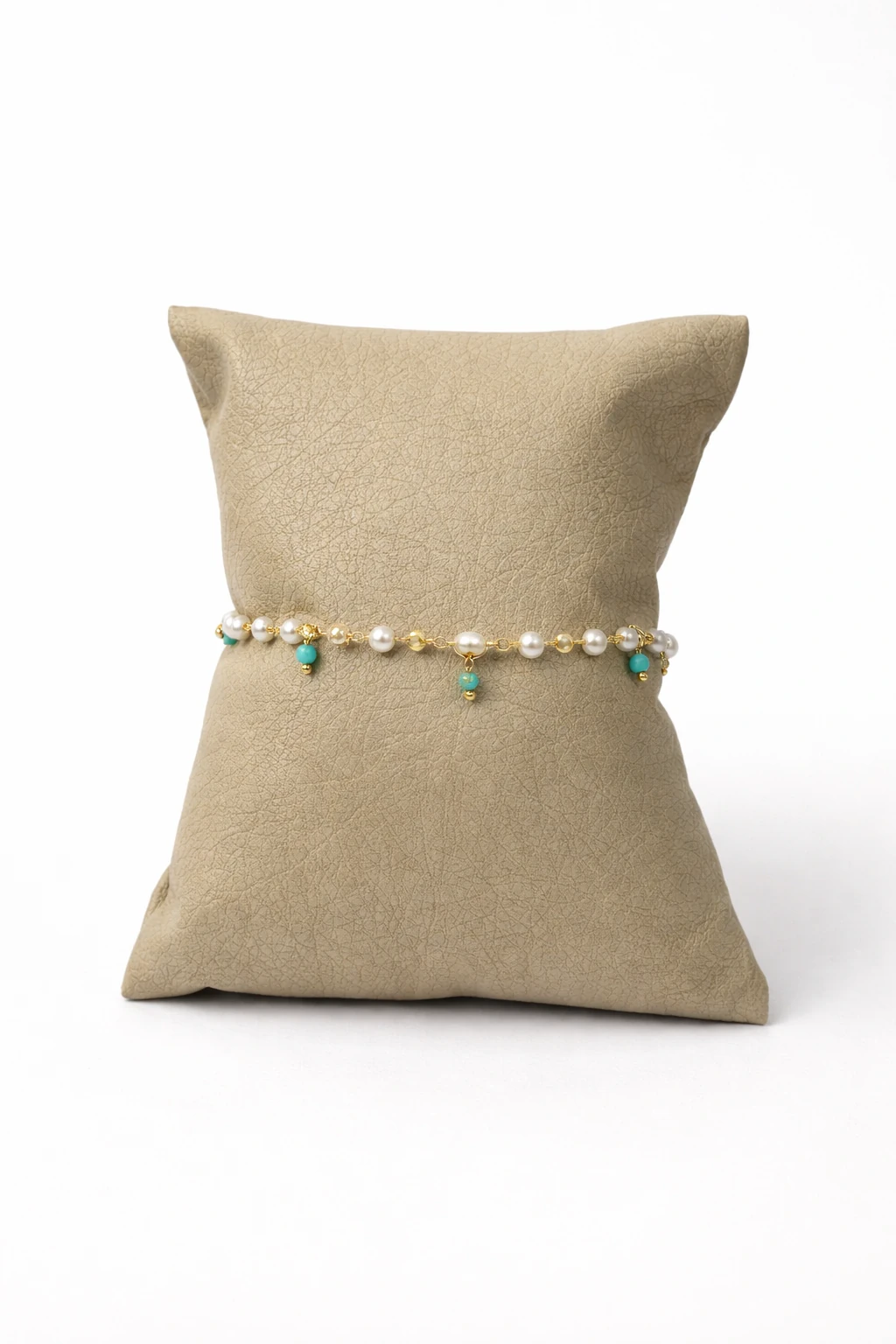 Delicada e cheia de charme, a pulseira dourada combina a elegância da pérola sintética com o toque vibrante da turquesa, criando um contraste sofisticado e moderno. Uma peça que traz leveza ao visual e adiciona um ponto de cor na medida certa, perfeita para usar sozinha com proposta mais clássica ou em mix de pulseiras para um look mais atual e estiloso.